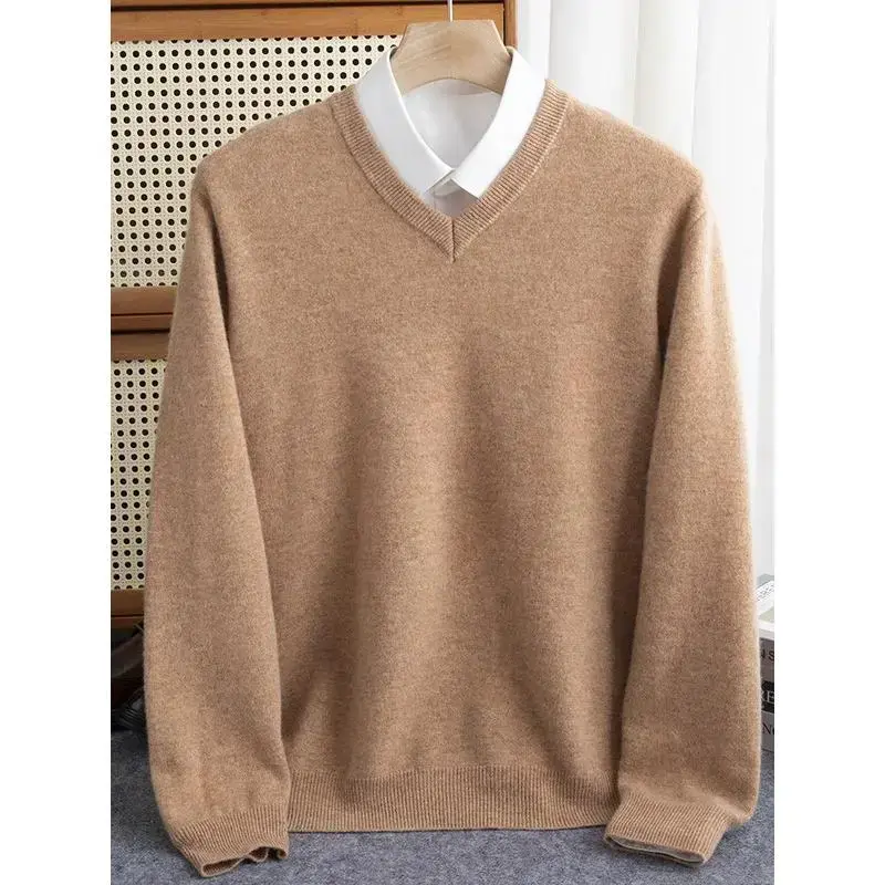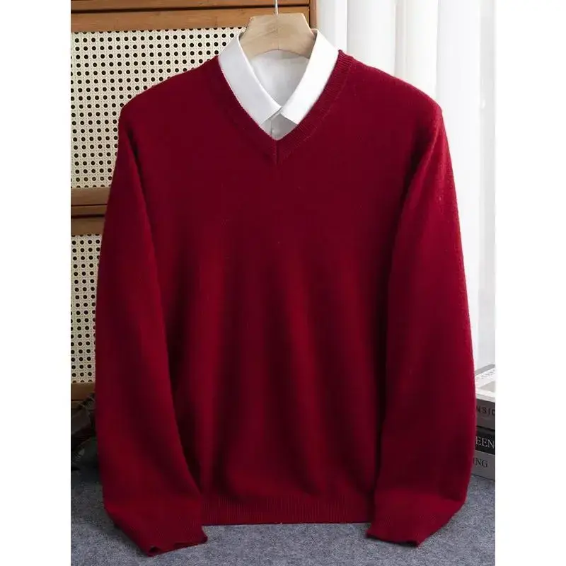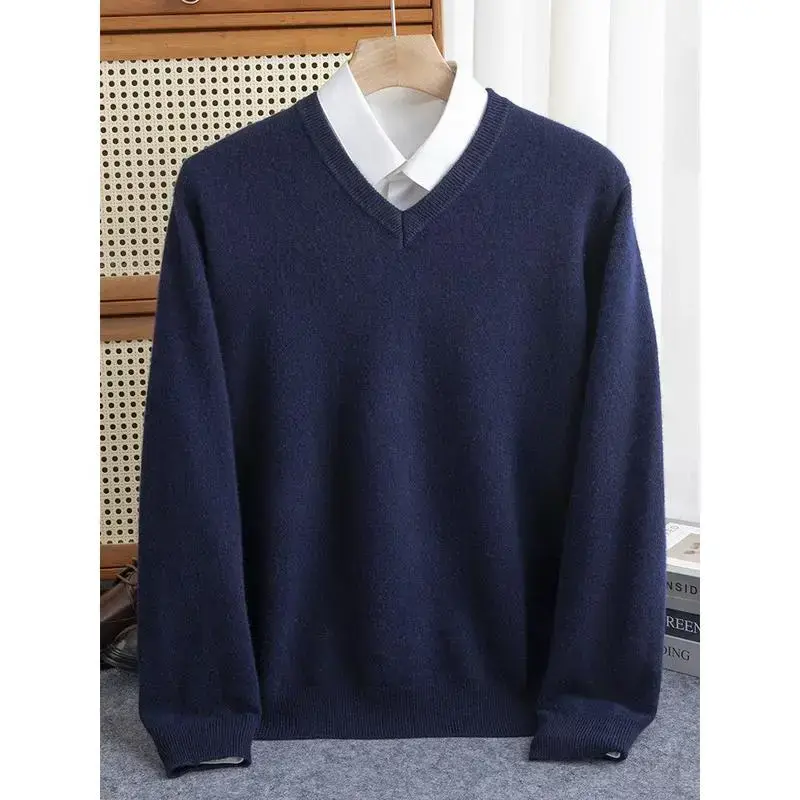 Men 100% Merino Wool Sweater V-Neck Pullover Autumn Winter Cashmere Warm Solid Knitwear Clothes Business Bottoming Soft Tops