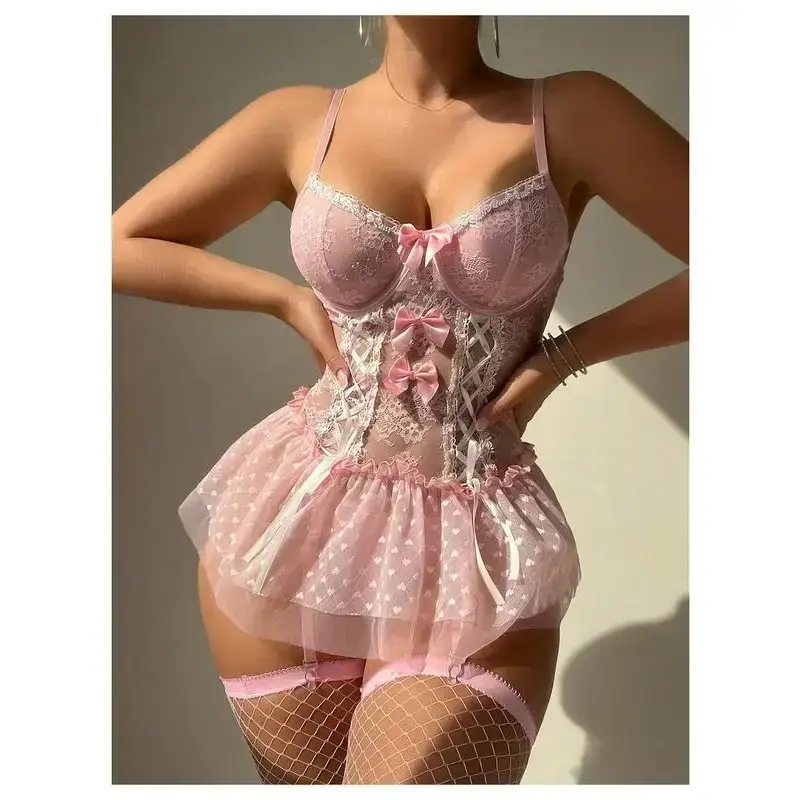 Features: Underwire, spaghetti strap, color block, hollow out back, camisole bra type, V-string panty, mid-rise, bow front, lace-up and ruffle hem details, comfy tops, thongs, garter and stockings set. Material: The fabric offers a medium stretch, providing a snug and flexible fit with a soft touch. Occasions: Suitable for intimate occasions, romantic evenings, honeymoon, or as a special surprise for a partner. Care Instructions: Hand wash carefully to maintain its quality. Do not dry clean. Size Chart:??Product Measurement?? S:Length:19.3/5.5IN,Underbust:24.0-37.0IN,Waist Size:23.6IN,Length:8.7IN,Waist Size:25.2-38.6IN M:Length:19.7/5.9IN,Underbust:25.6-38.6IN,Waist Size:25.2IN,Length:9.1IN,Waist Size:26.8-40.2IN L:Length:20.1/6.3IN,Underbust:27.2-40.2IN,Waist Size:26.8IN,Length:9.4IN,Waist Size:28.3-41.7IN XL:Length:20.5/6.7IN,Underbust:28.7-41.7IN,Waist Size:28.3IN,Length:9.8IN,Waist Size:29.9-43.3IN