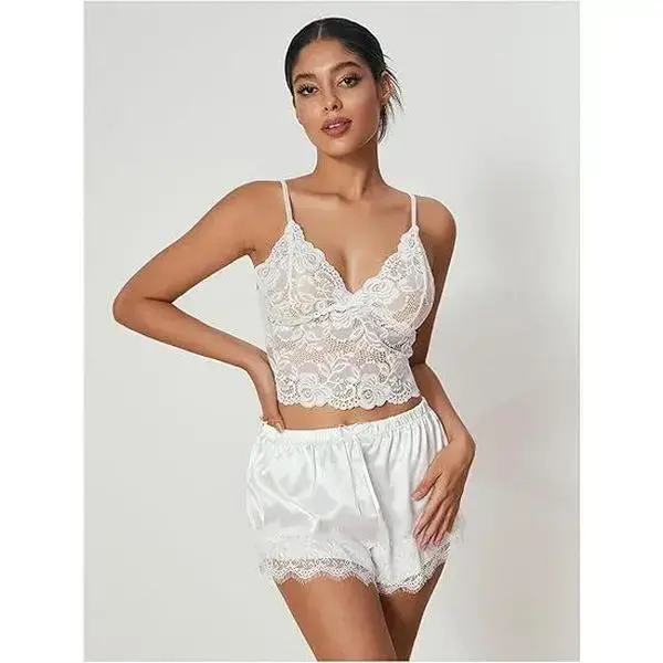 Women's Honeymoon Sets Silk Satin Bridal Pajamas Set 4pcs Floral Lace Cami Sleepwear with Robe