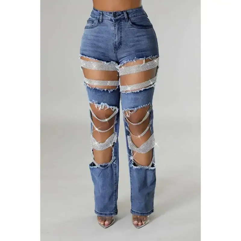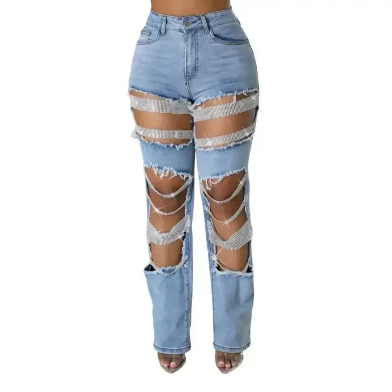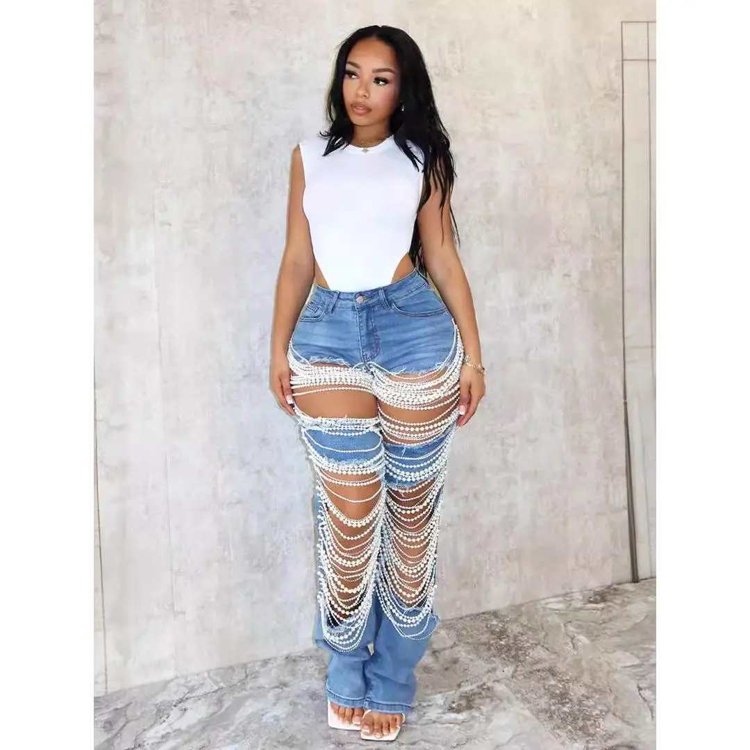 Women Fashion Pearl Beading Ripped Hollow Out Tassel Wide Leg Jeans 2024 New Summer Street Denim Pants