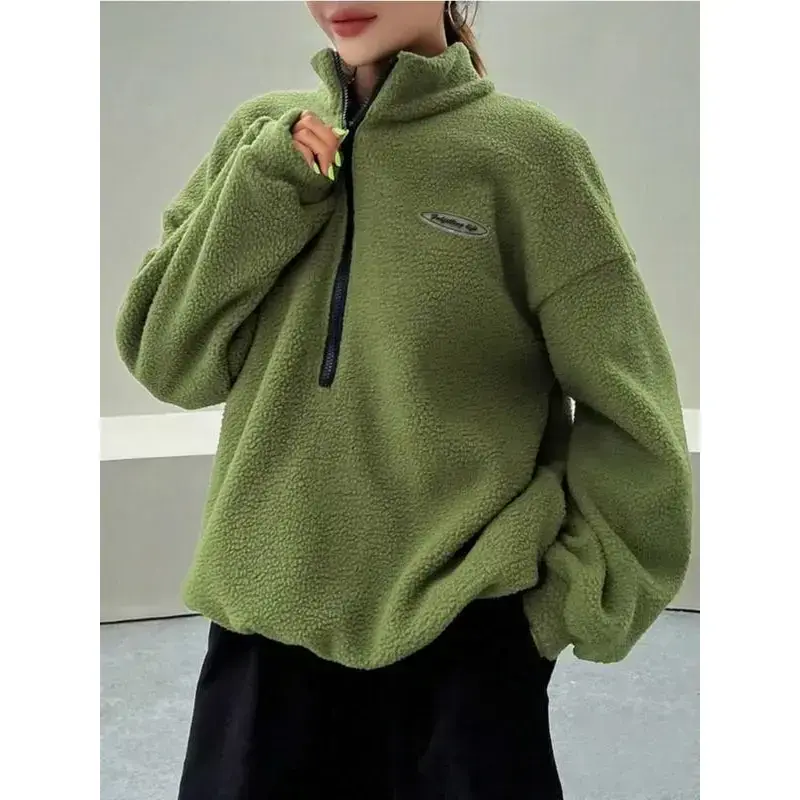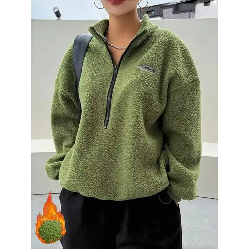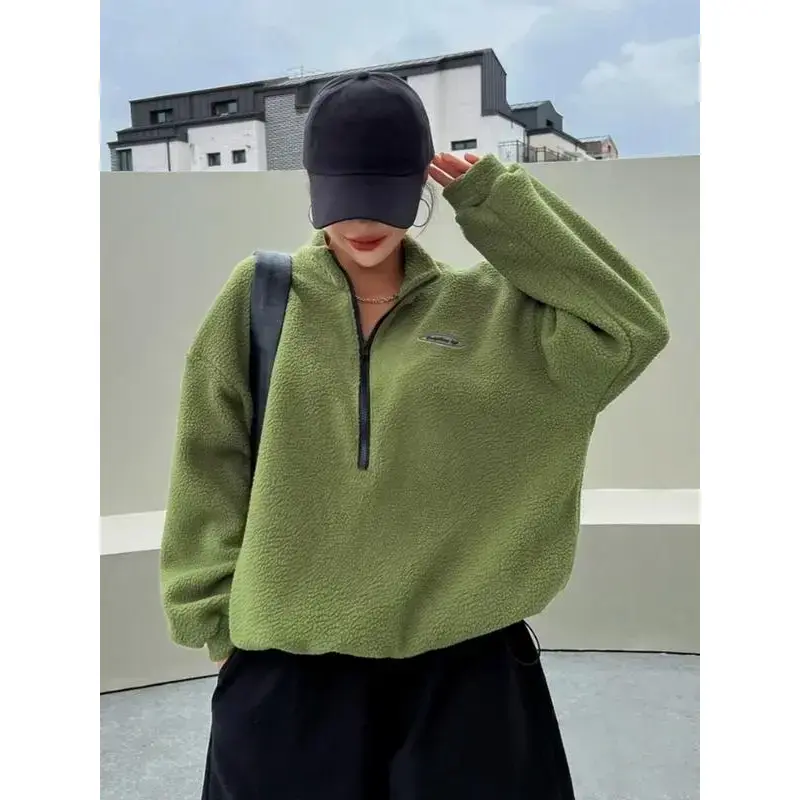 Zippered fuzzy pullover, casual long-sleeve high collar, bottom drawstring, loose fit, versatile autumn and winter sweatshirt for women.