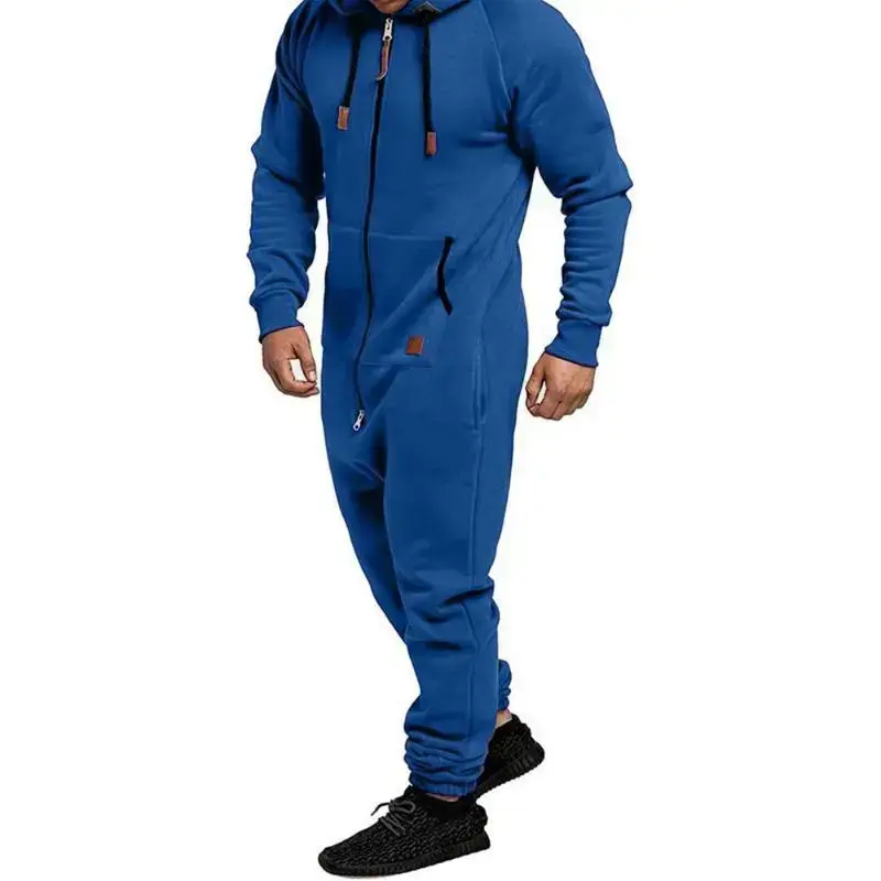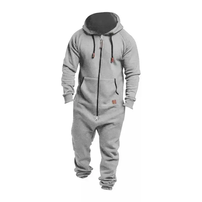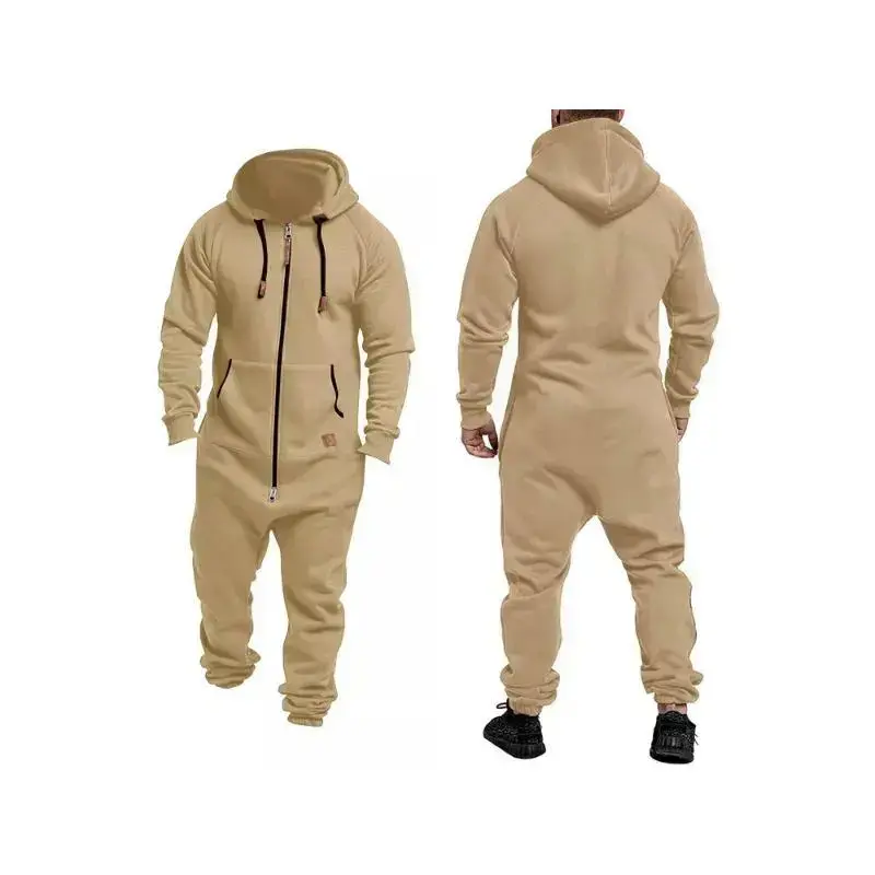 Men's Beige Thermal Fleece Lined Hooded Jumpsuit with Pockets Full Zipper Long Sleeves Adjustable Drawstring Comfortable Sportswear Menswear Overalls Knitting
