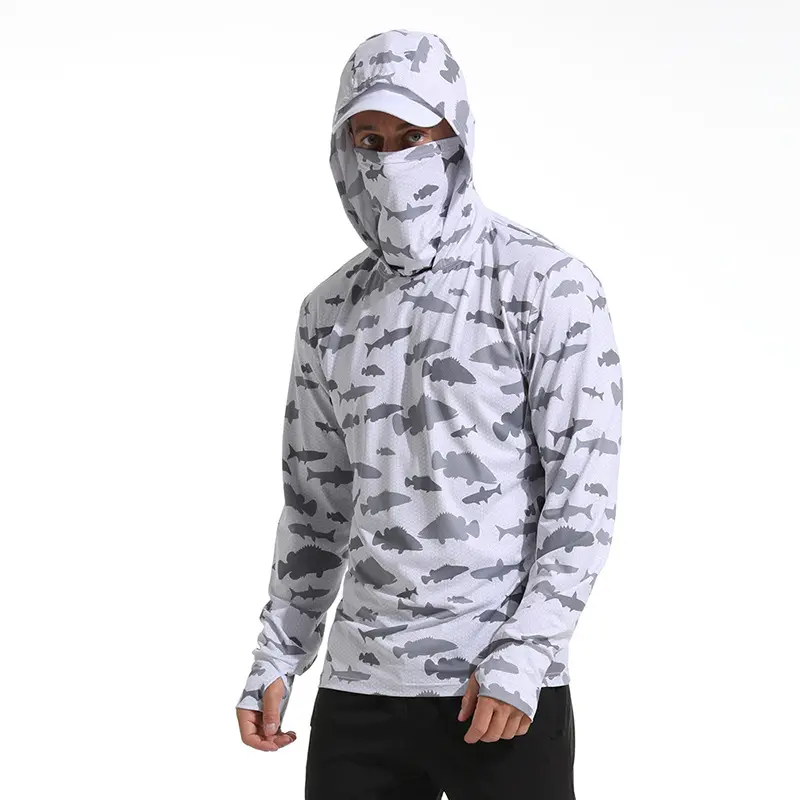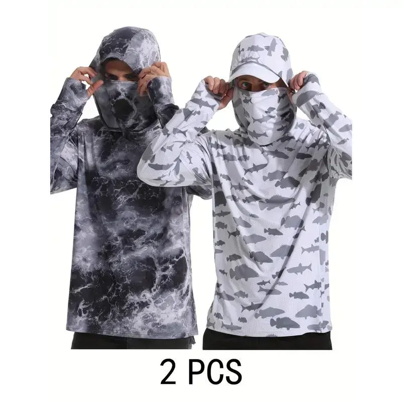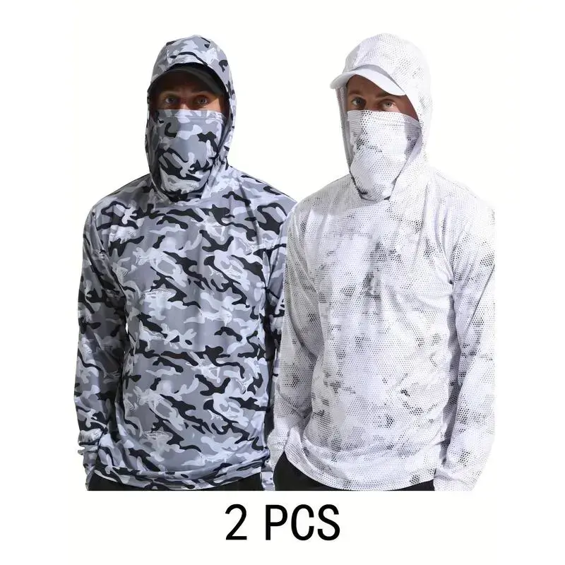 2pcsCamoQuick-DryLightweightHoodedFishingSunProtectionShirt-BreathableLongSleeveOutdoorGearforMen,White&GrayPattern,UVProtection,Fishing&Hiking