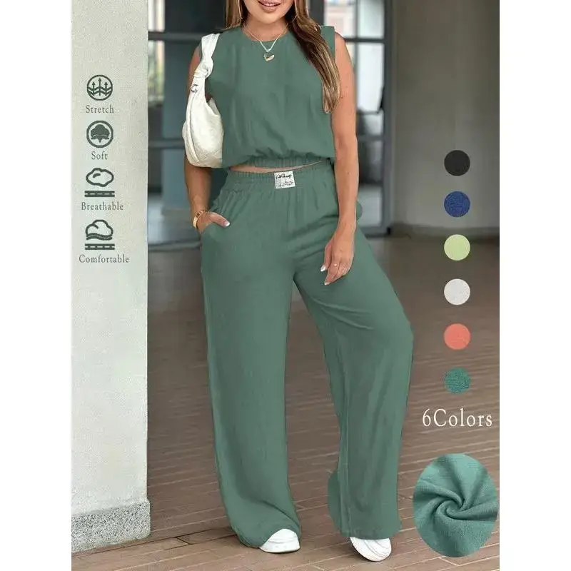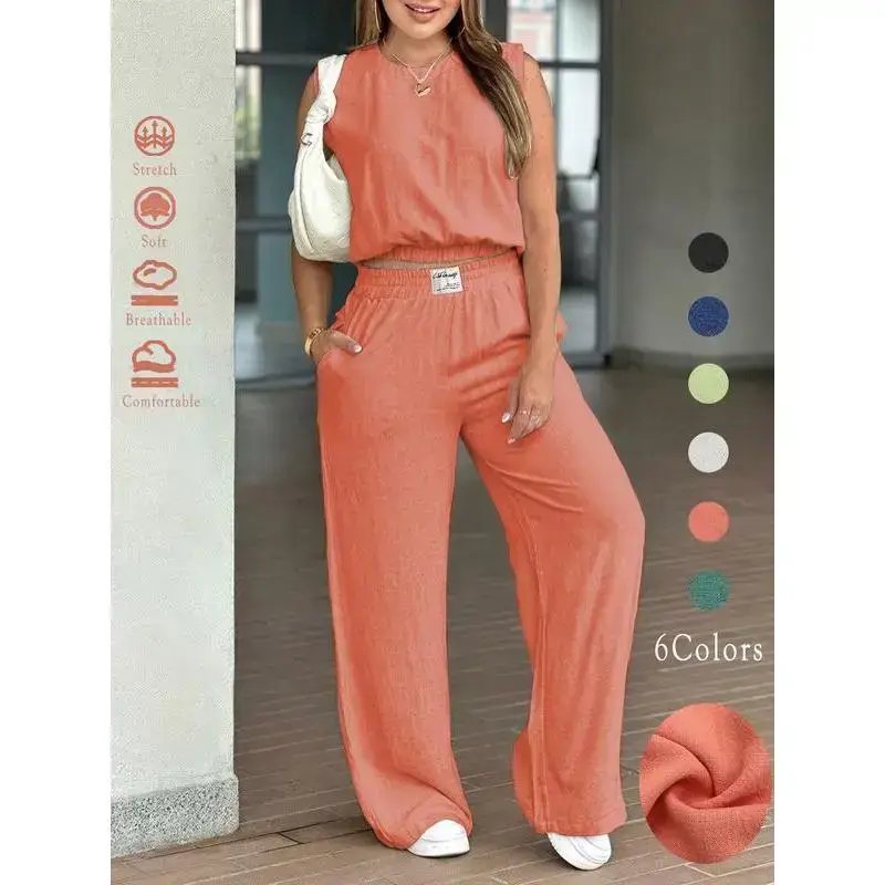 Season:Summer Fit:Fitted Style:Casual Top Length:Regular Length Region Of Origin:China Washing Instructions:Do Not Dry Clean,Machine Washable Weaving Method:Woven Quantity Per Pack:2 pcs Pattern:Plain Composition:Elastane 5%Polyester 95% [Lightweight Fabric]: Crafted from breathable linen, ensuring airy wear during hot summer days, for staying cool and relaxed. [Chic Color Palette]: Featuring a trendy milk cow color scheme, this set brings a fresh and modern vibe to your summer wardrobe. [Roomy Fit]: The loose fit of the sleeveless top and wide-leg pants allows for effortless movement, ideal for active lifestyles. [Features]: Designed with an elastic waistband for an adjustable fit, accommodating various body shapes for added convenience. [Everyday Wear]: Versatile matching set suitable for various occasions, easily transitioning from casual outings to home relaxation.