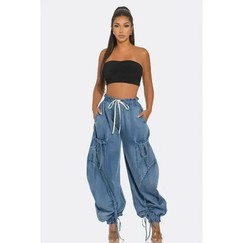 Lace Up Wide Leg Jeans Cargo Pants Sexy Women High Waist Elegant Streetwear Denim Loose Trousers