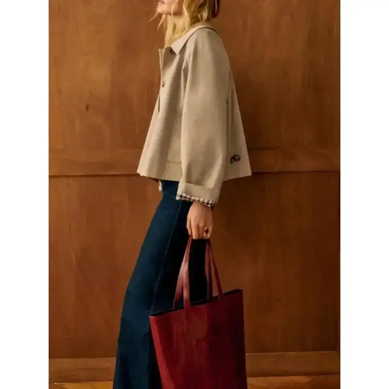 Single Breasted Women Short Trench Coat Interior Plaid Turn-Down Collar Lady Loose Windbreaker 2025 Cotton Fabric
