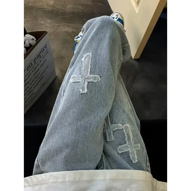 Y2K American New Pattern Embroidery Blacks Baggy Jean Boys Men High Street Vintage Hip Hop Fashion Casual Joker Couple Wide-leg