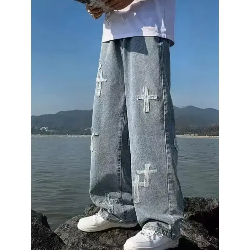 men Men's Loose-Fit Straight-Leg Jeans with Cross Design - Casual Denim Pants, Machine Washable, All-Season Wear, Blend Streetwear Menswear