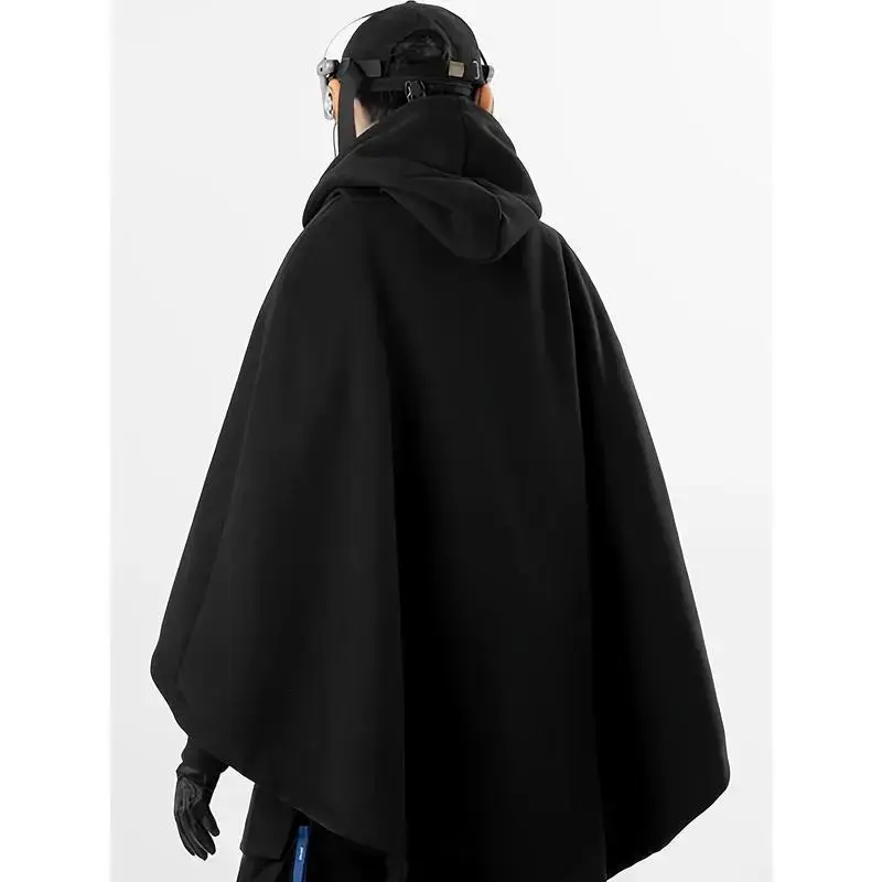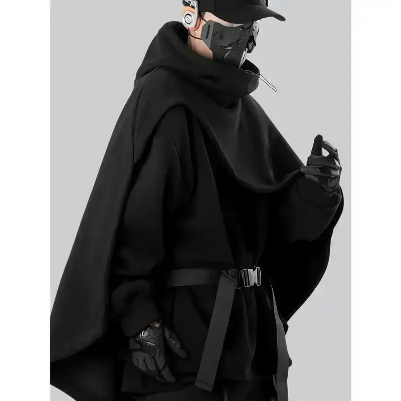 Men's Functional Style Collar Cloak Hoodie Hooded Two-piece Cloak Jacket (Single Top Without Belt Accessories) Long Sleeve Black