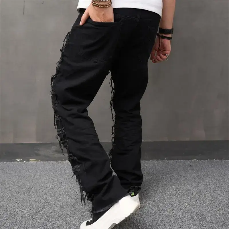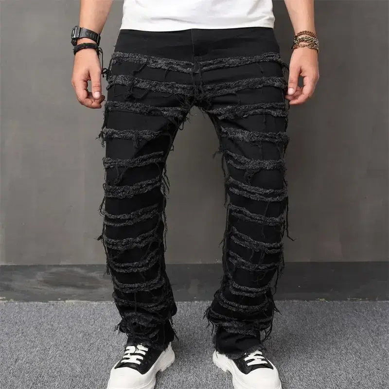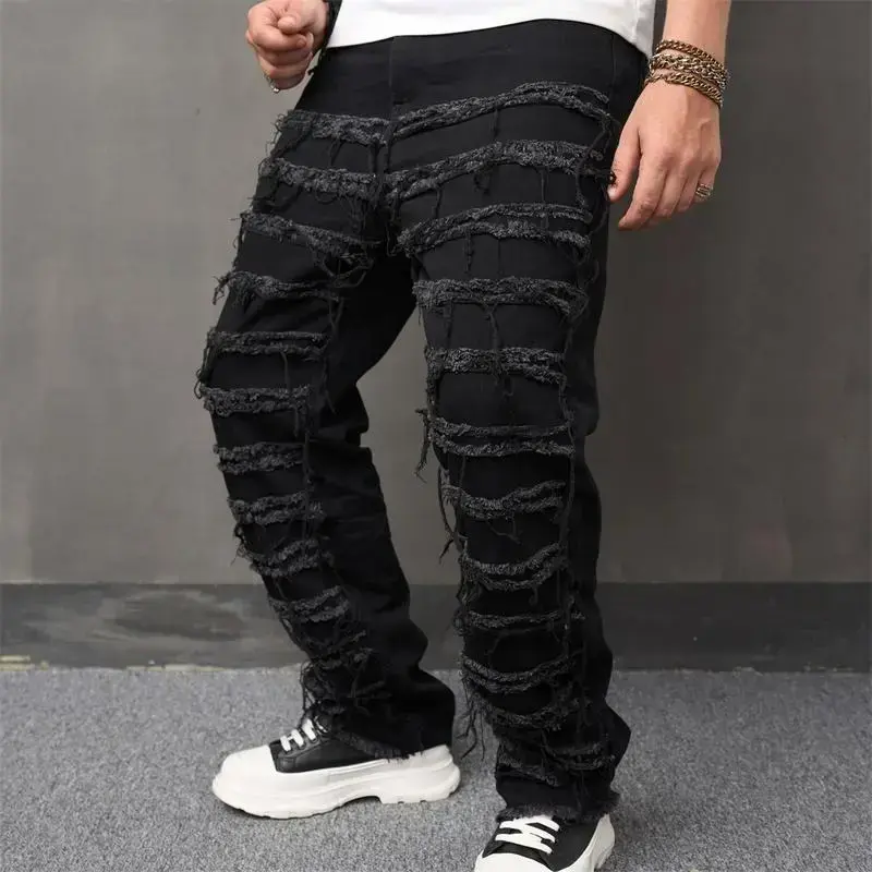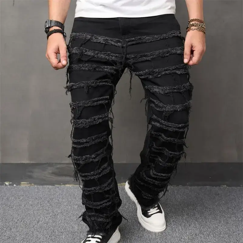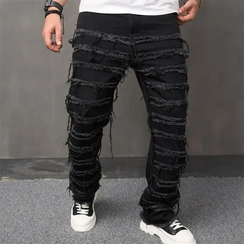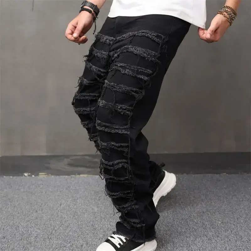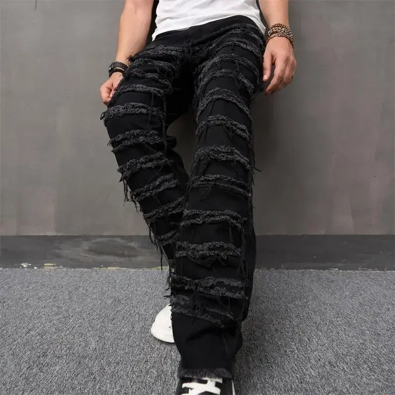 Men's High Street Hip Hop Biker Jeans - Distressed Stacked & Spliced Design, Loose Straight Leg Denim Pants for Streetwear & Motorcycle Riding Elastic Menswear
