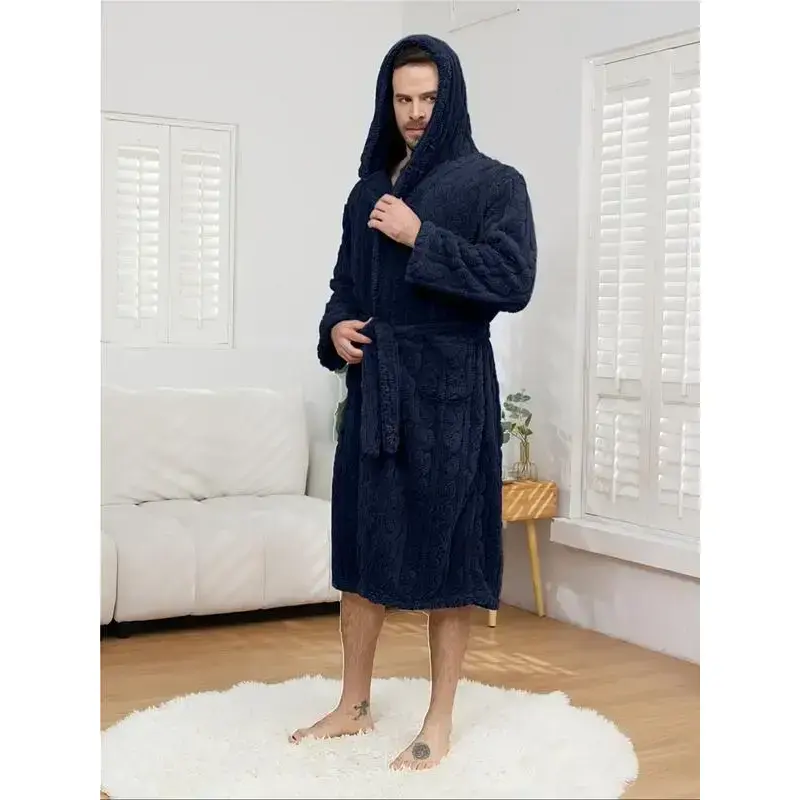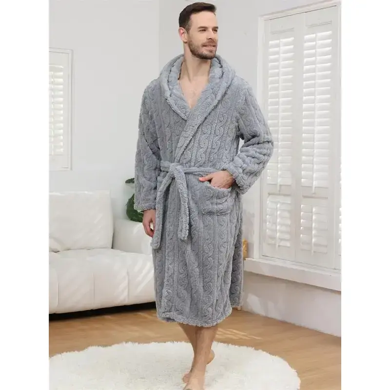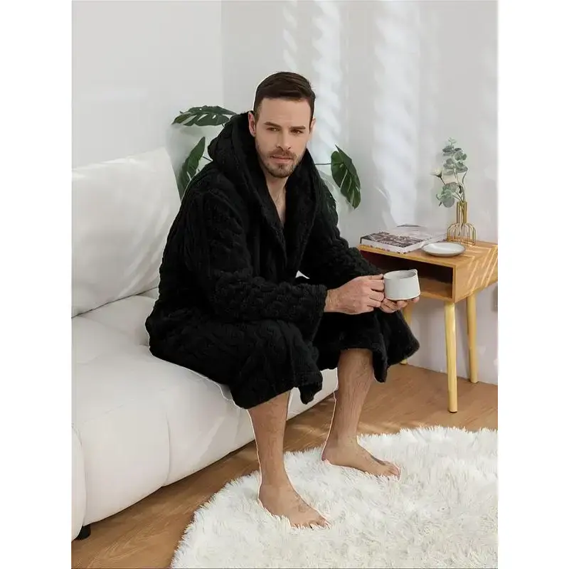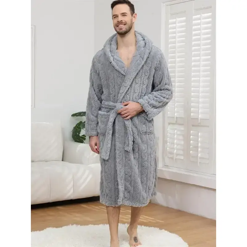 Men's Thickened Knitted Sleep Robe for Fall & Winter, Casual Loose-Fitting Bathrobe in Solid Color, Comfortable Cotton Blend Fabric