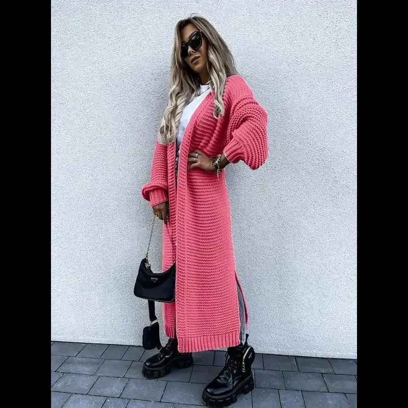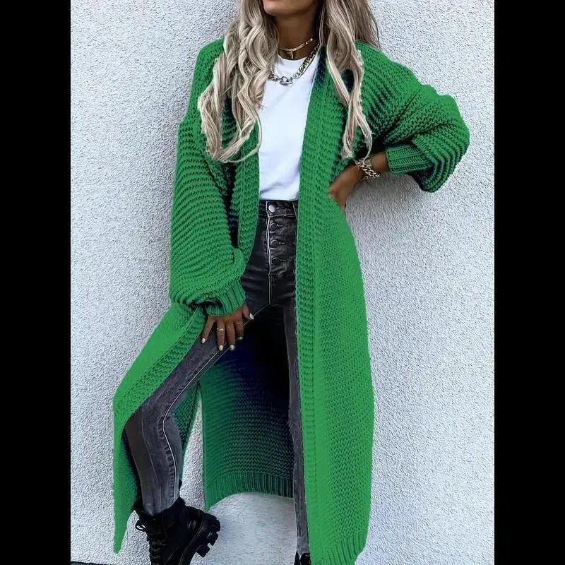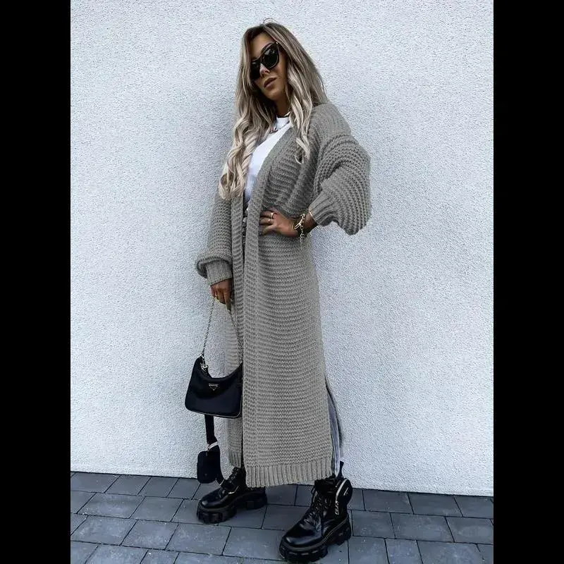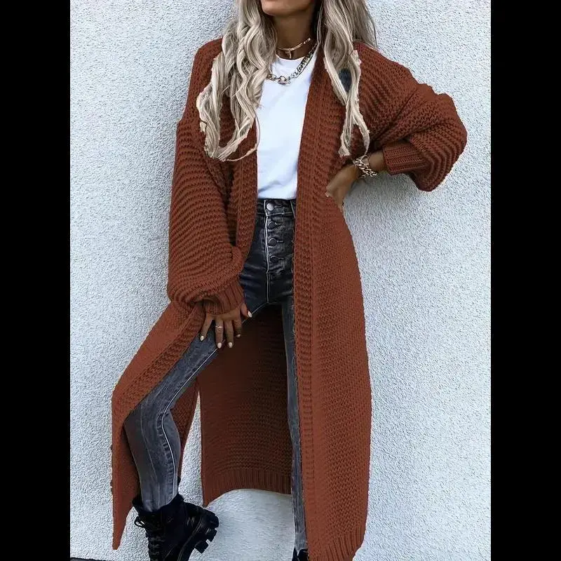 Women's Solid Split Hem Bishop Sleeve Open Front Longline Cardigan, Long Sleeve Knitwear for Fall & Winter, Knit Clothing for Daily Wear, Womenswear