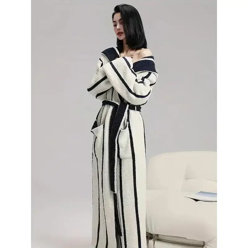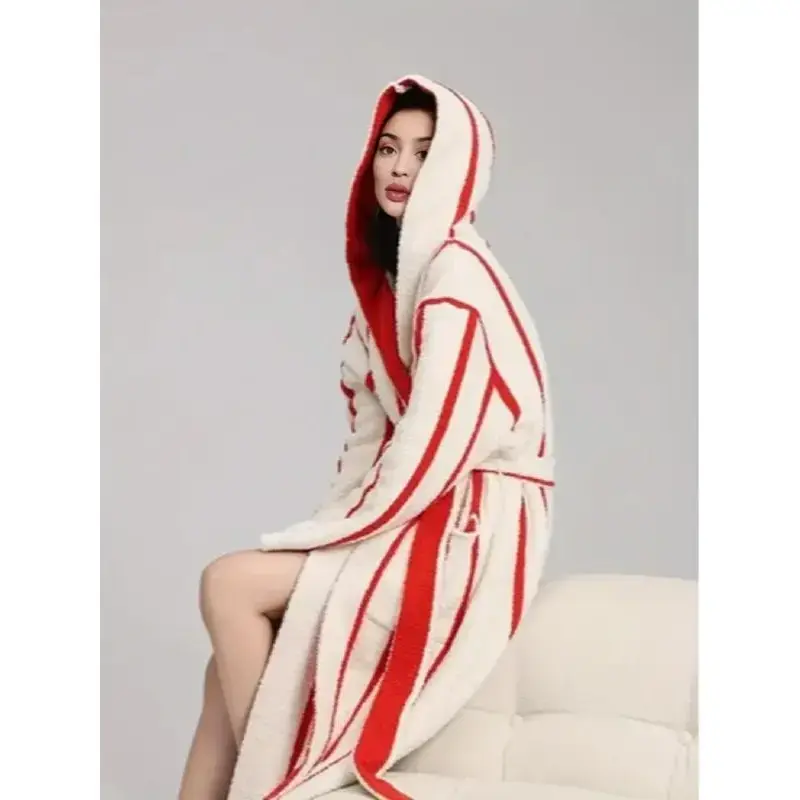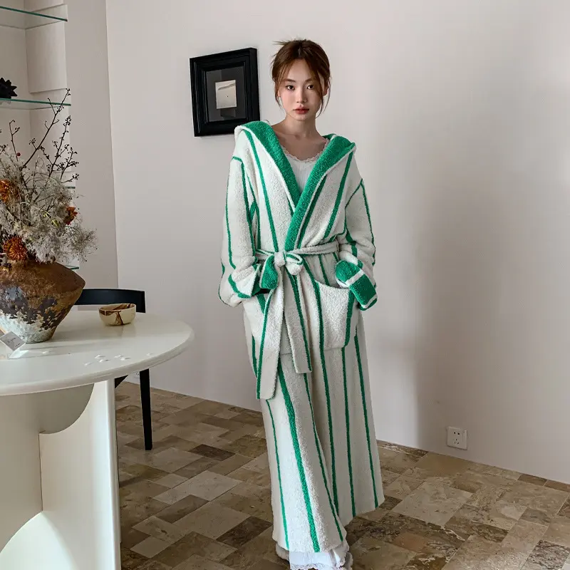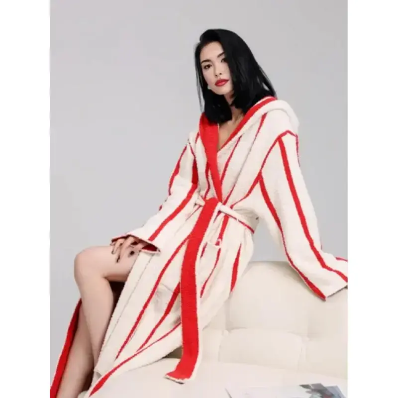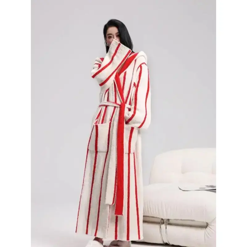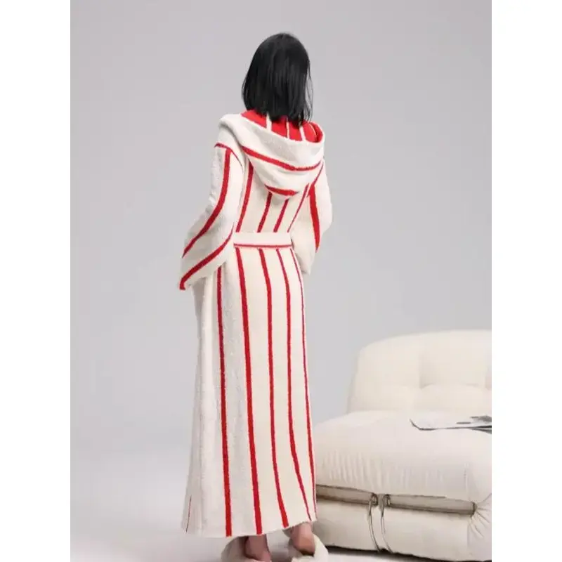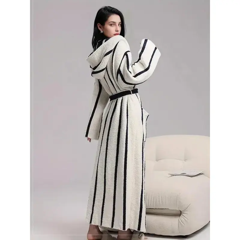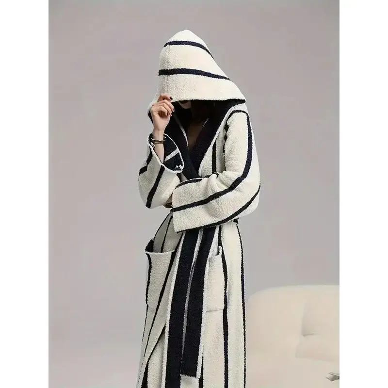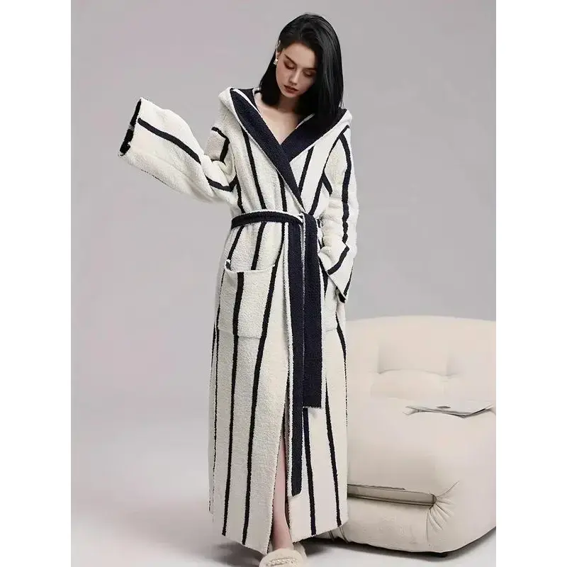 ??Two-Sided Fabric??: Featuring double-sided plush material, this robe offers a luxuriously soft texture that enhances warmth. ??Extended Length??: The long design provides extra coverage, making it suitable for staying cozy during chilly fall and winter days. ??Hooded Feature??: Equipped with a hood, this robe adds extra warmth to your head and neck while maintaining a casual look. ??Thick Construction??: Crafted with thick fabric, it ensures significant insulation, ideal for colder weather while retaining a snug feel. ??Striped Pattern??: The striped pattern adds a classic touch, differentiating this robe from other plain alternatives in the market.