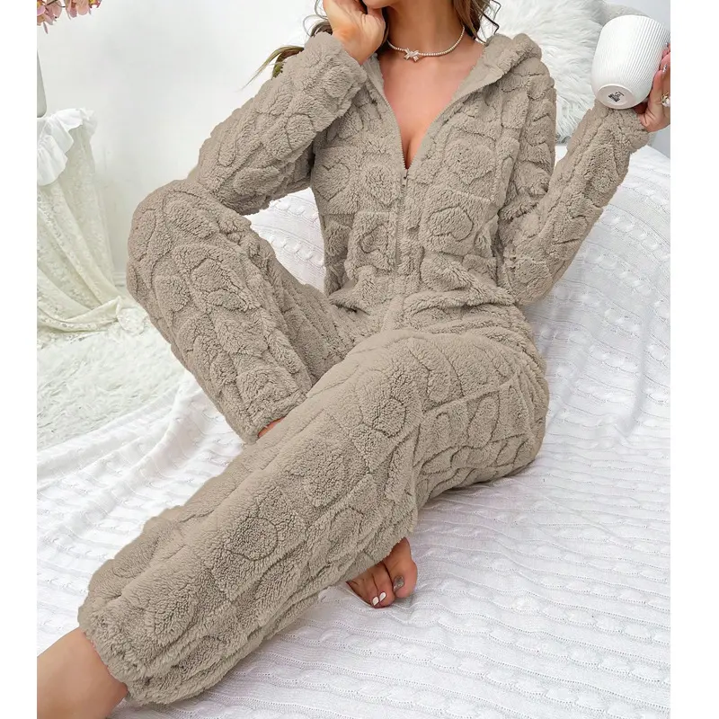Women's Fuzzy Onesie Pajamas Set, Long Sleeve Hooded Zipper Design, Cute Heart Pattern, Thick Fabric, Fall & Winter Home Wear(gift)(gift)