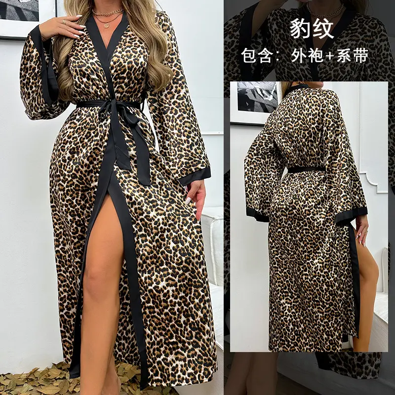 Composition??95% Polyester,5% Elastane Material??Satin Belt??Yes Sleeve Length??Long Sleeve Details??Patterned Pattern??Leopard Applicable People??Adult Sheer??No Collar Style??V-neck Type??Dressing Gown Season??Spring/Fall Operation Instruction??Machine wash or professional dry clean Style??Royal Printing Type??Random Printing Fabric Elasticity??Micro Elasticity Weaving Method??Woven Item ID??PC139812 Origin??Jiangsu,China