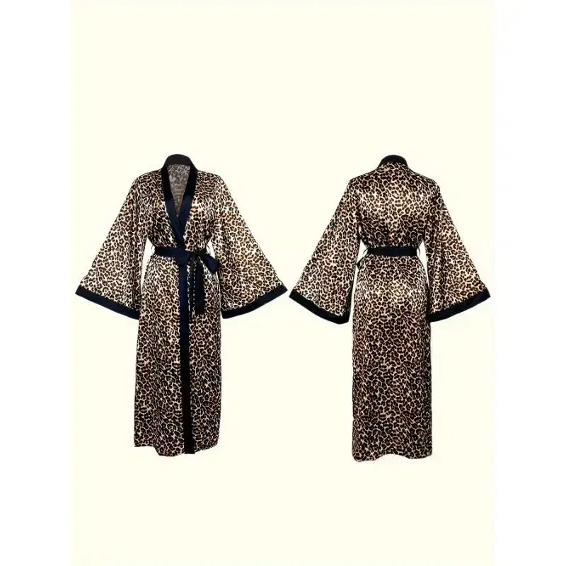 Royal Style Leopard Print Satin Robe for Women - V-Neck Long Sleeve with Belt, Elegant Home Wear Sleepwear, Soft & Luxurious Autumn Winter Loungewear, Formal Evening Wear | Elegant Loungewear | Polyester Fabri Fabric Womenswear