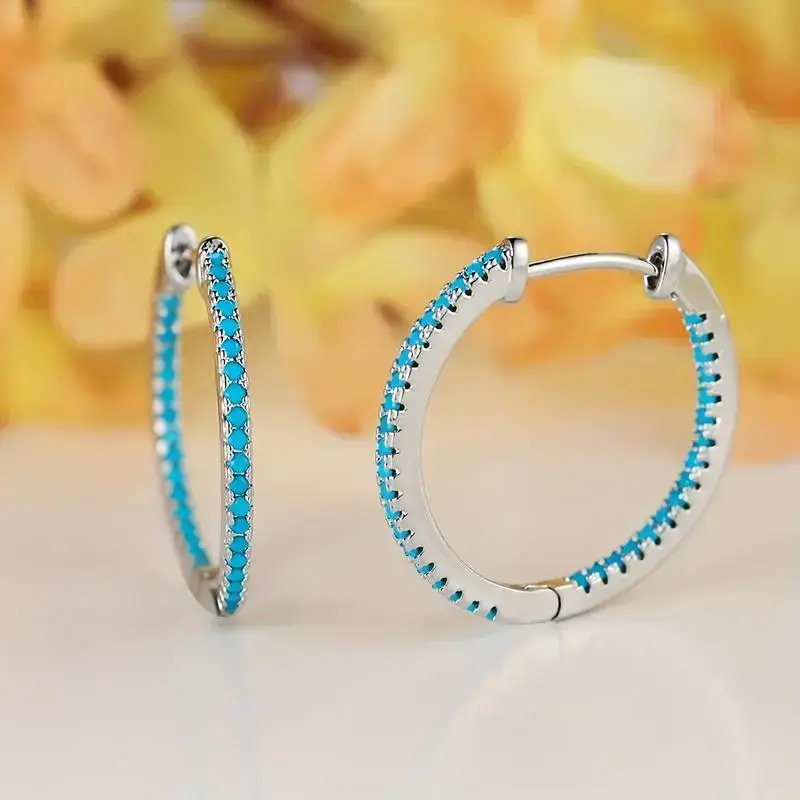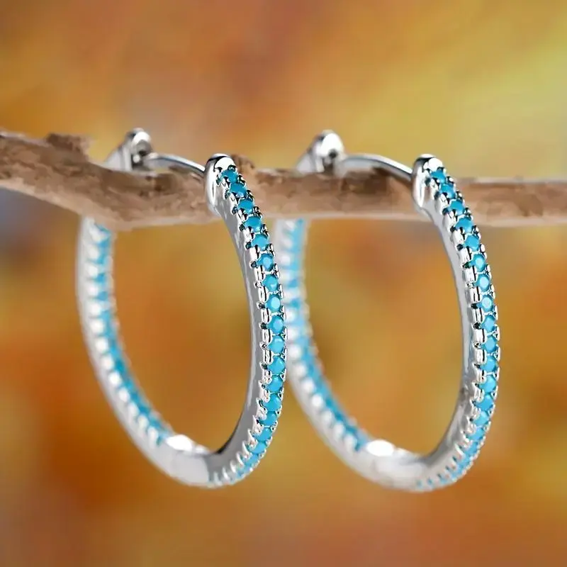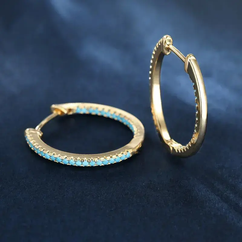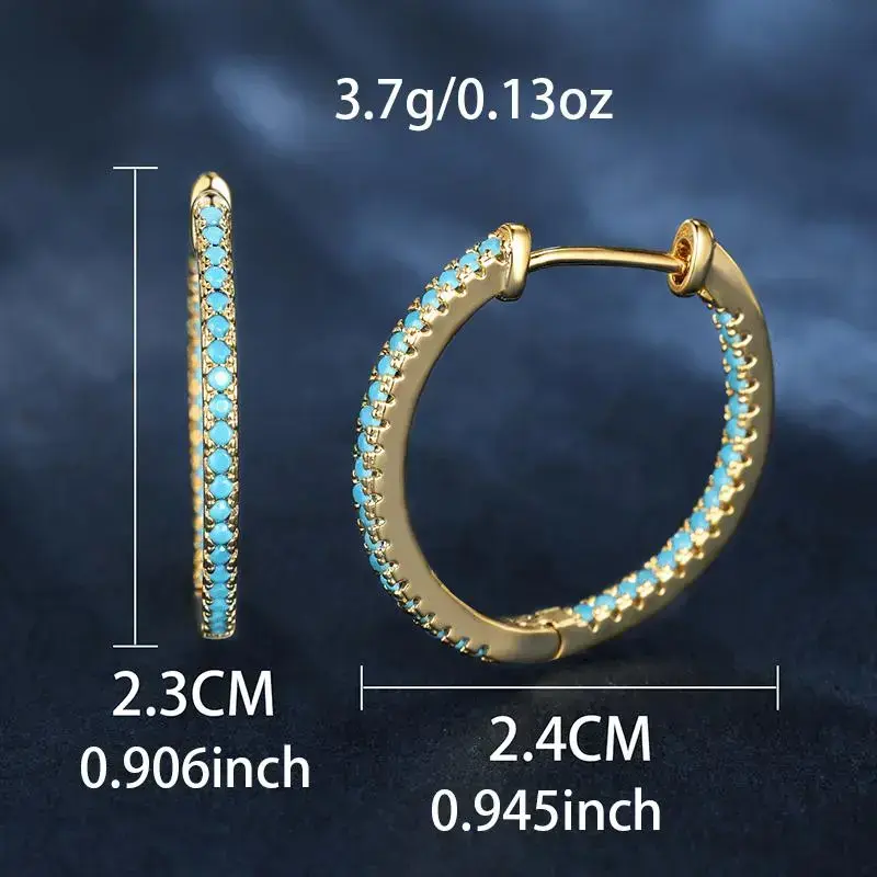 Golden / Silvery Hoop Earrings With Full Blue Turquoise Beads Decor Bohemian Style Copper 18K Gold Plated Jewelry Female Gift