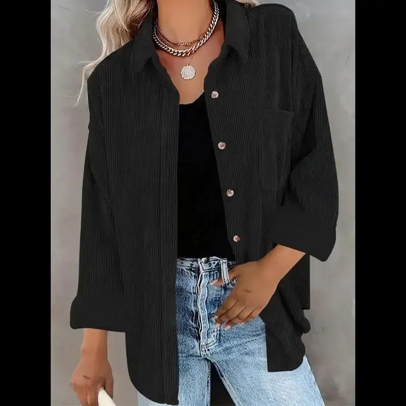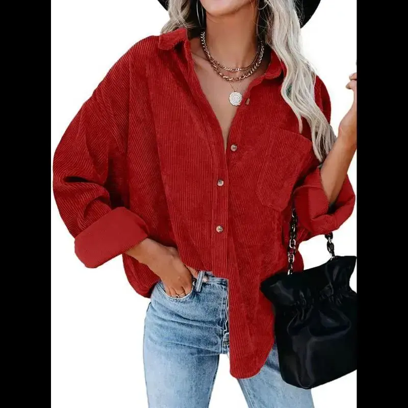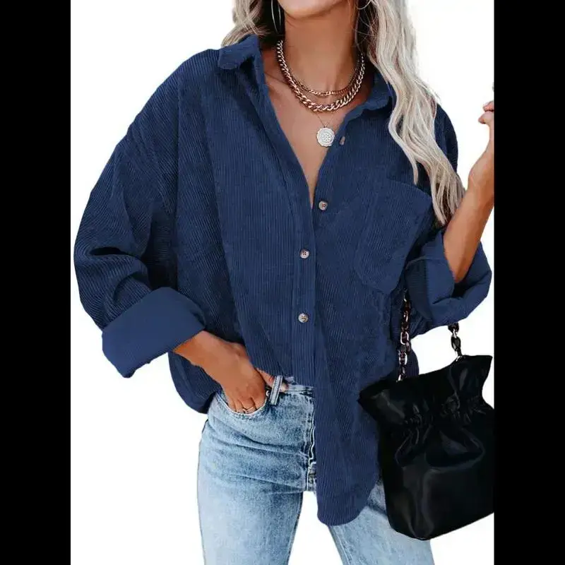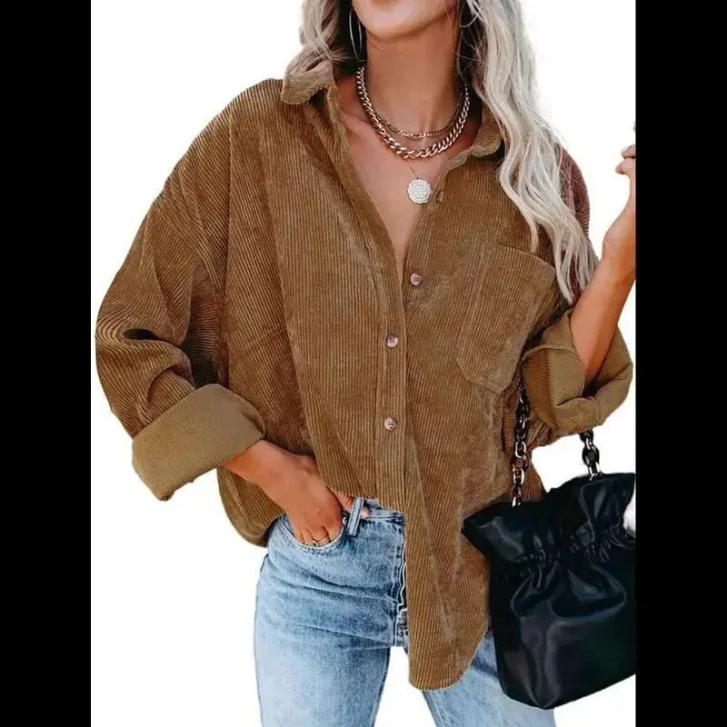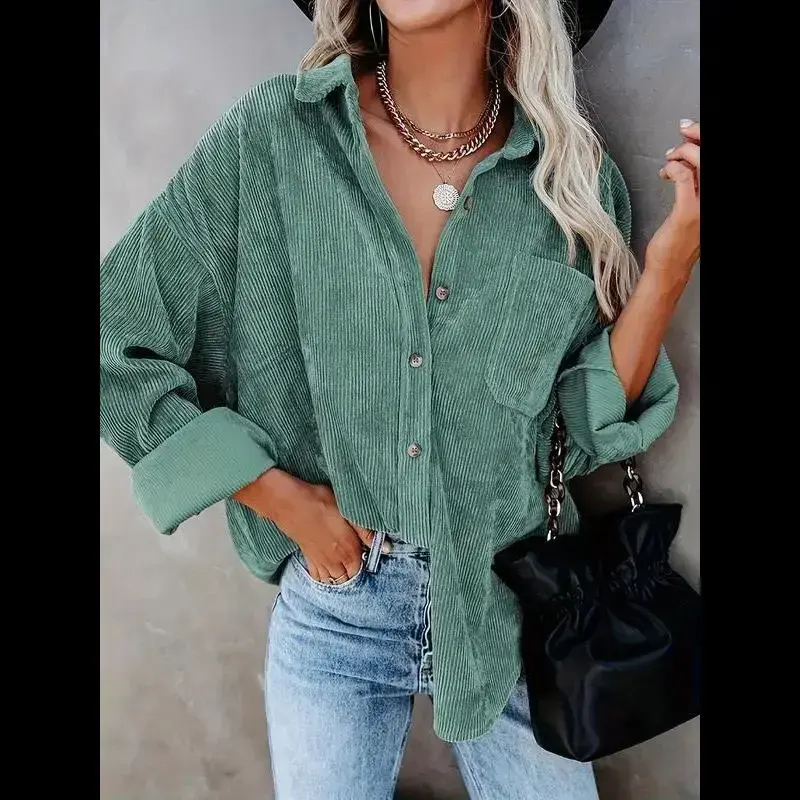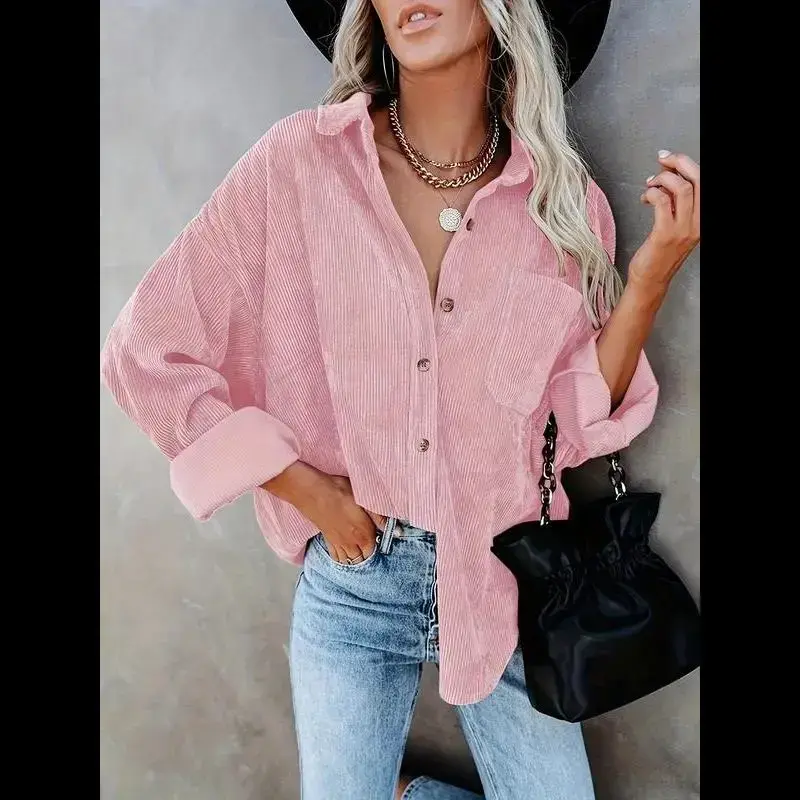 Women's Plain Pocket Button Front Corduroy Shirt, Going Out Tops, Casual Drop Shoulder Long Sleeve Blouse Top for Spring & Fall, Clothes for Women, Ladies Clothes for Daily Wear, Tops for Women