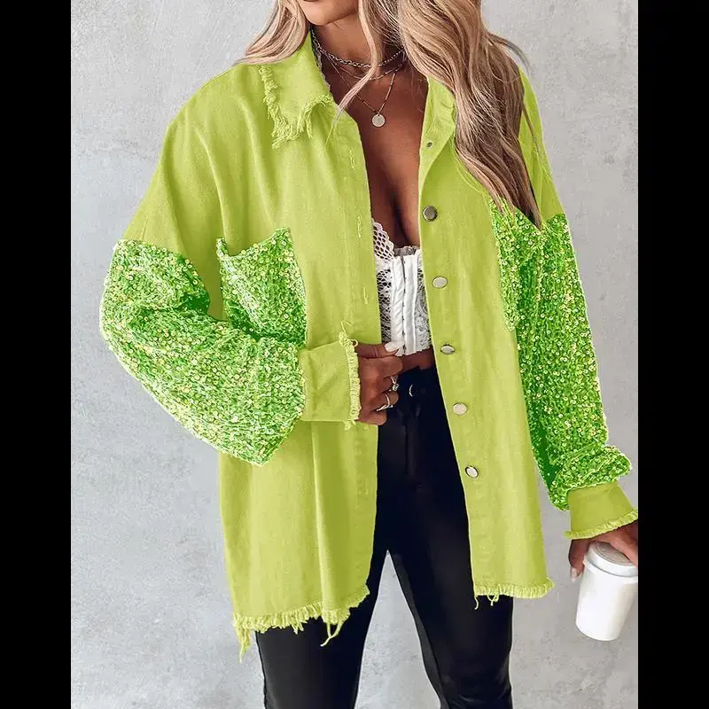 About this Item/A Unique Shacket design, Oversized cut/ Collared Button down closure / Sequin sleeve / High-Low raw hem./Sparkling Sequin long sleeve, make you shine in the crowd.Perfect for layering over your favorite shirts and dresses./Crafted from premium denim fabric, fine tailoring and detailed patchwork,suitable for multi-occasions./Product Details/Style:Chic/Type:Shacket/Material:100% Cotton/Neckline:Turn-down Collar/Sleeve Style:Long Sleeve/Pattern Type:Colorblock/Decoration:Contrast Sequin,Raw Hem/Fit Type:Regular/Package Include:1*Shacket/Instructions:Hand wash, do not dry clean/Size Guide (Body Measurements for Reference)