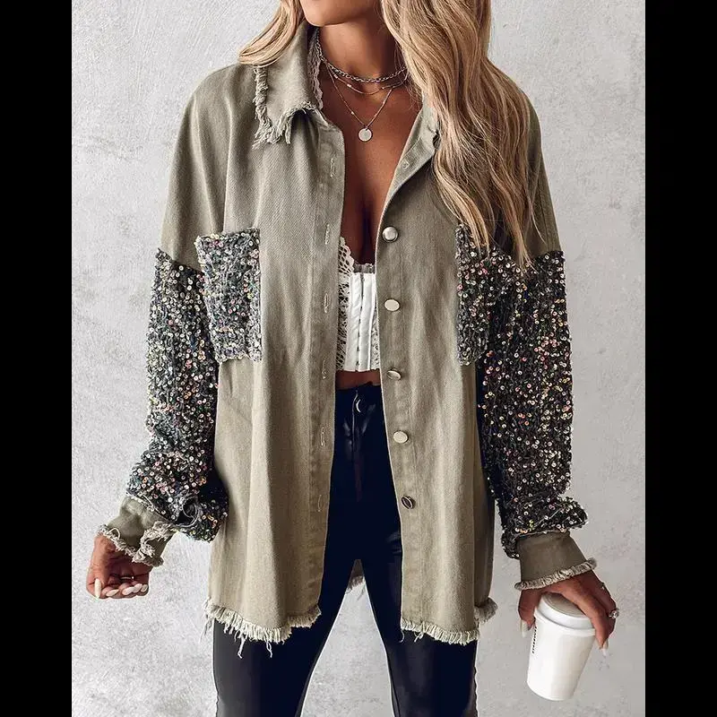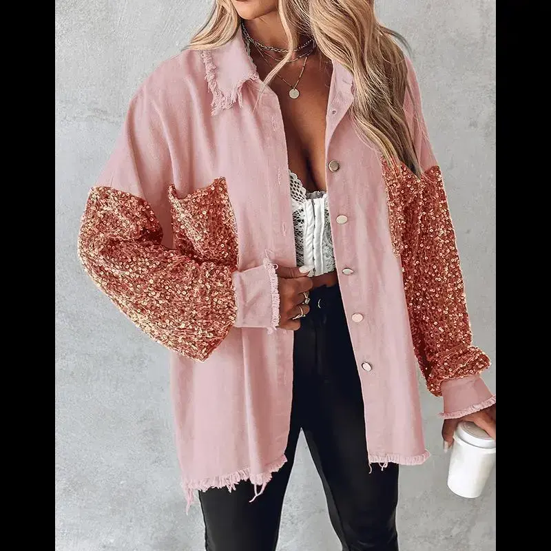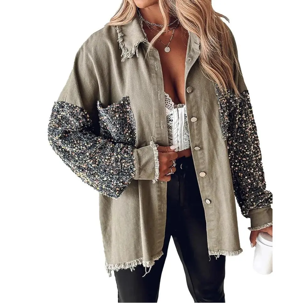 Women's Luxury Contrast Sequin Raw Hem Shacket Collared Corduroy Plaid Shirt Style Double Button Lapel Oversized Cut Denim Bomber Jacket Outerwear Perfect for Casual Outings Evening Gatherings Fall Winter Wear Soft Comfortable Fabric