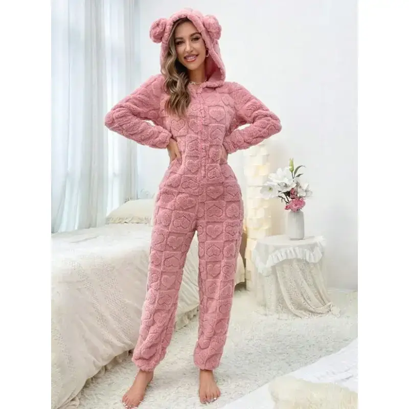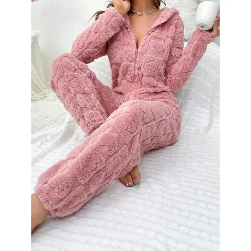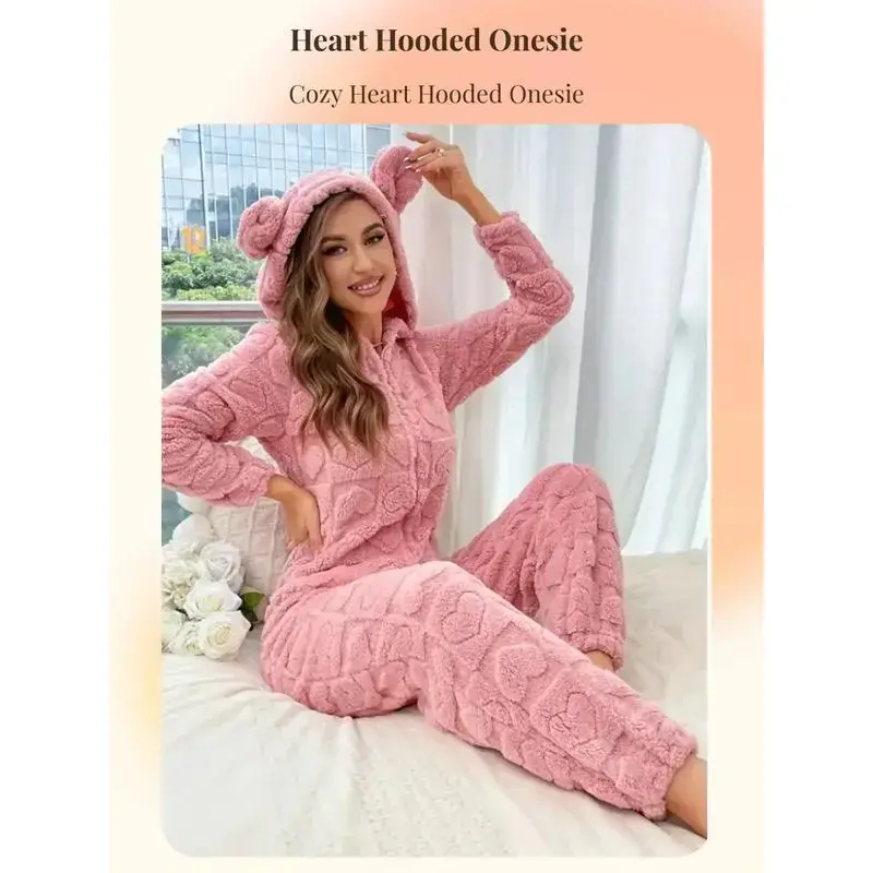 Women's Fuzzy Onesie Pajamas Set, Long Sleeve Hooded Zipper Design, Cute Heart Pattern, Thick Fabric, Fall & Winter Home Wear(gift)