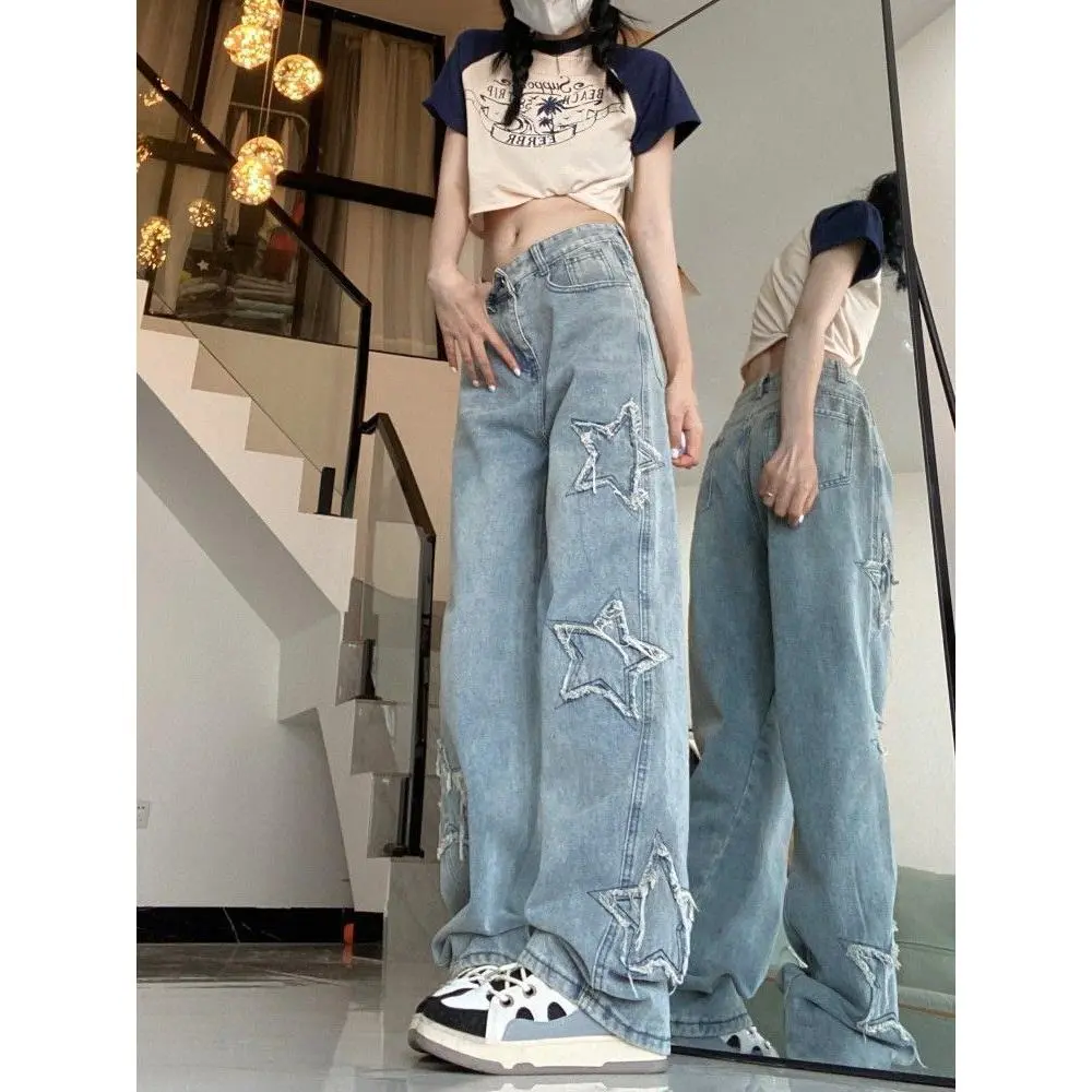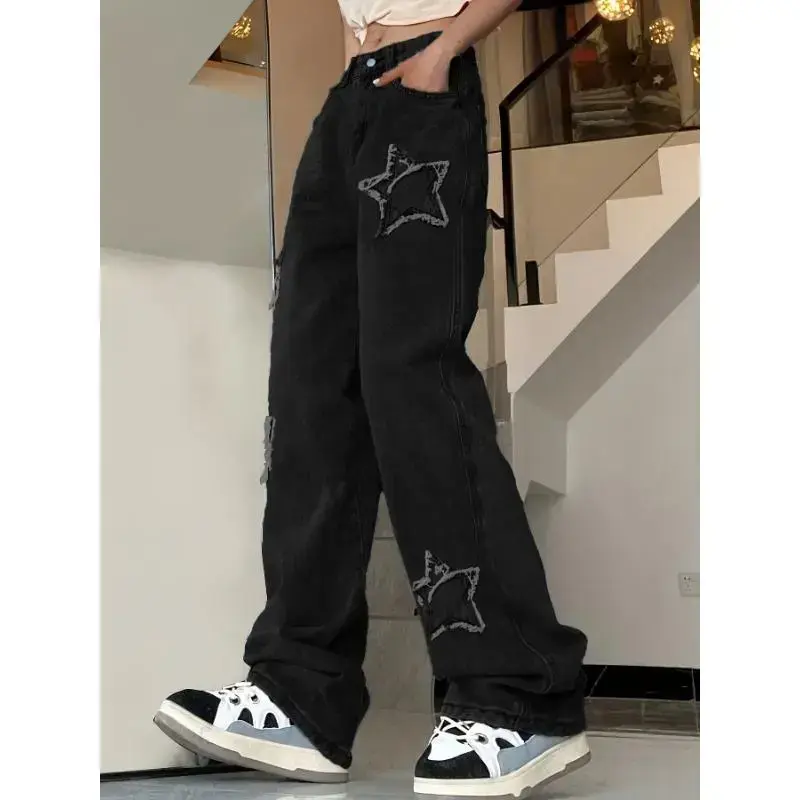 Women's Vintage Embroidered Star Patchwork Loose Fit Straight Leg Jeans - Mid-Rise Non-Stretch Denim Pants with Slant Pockets, Machine Washable All-Season Casual Elegant Pants, Embroidered Jeans, Everyday Fashion, Retro Style Appa