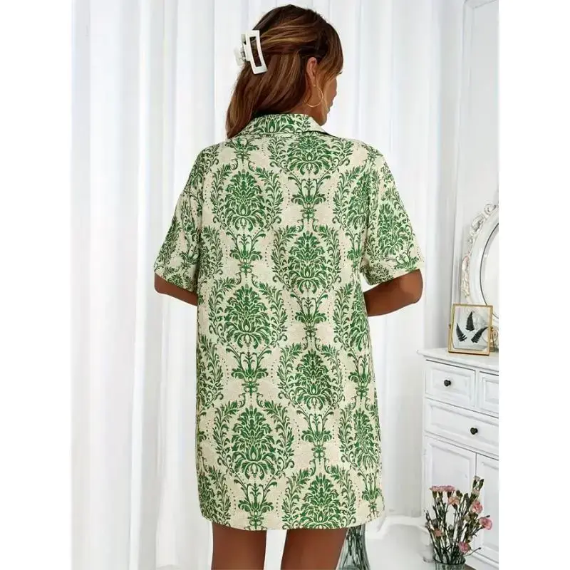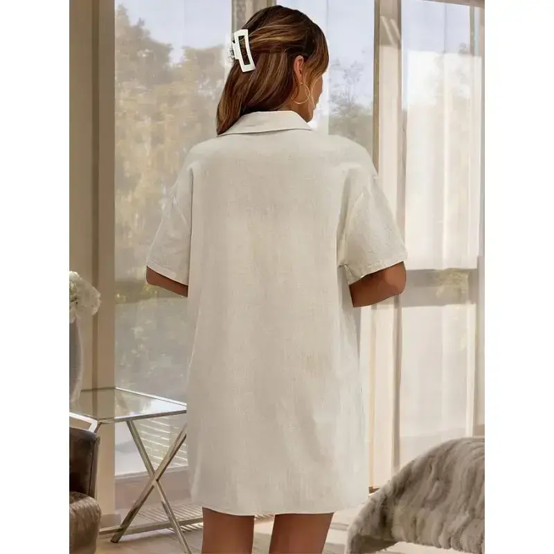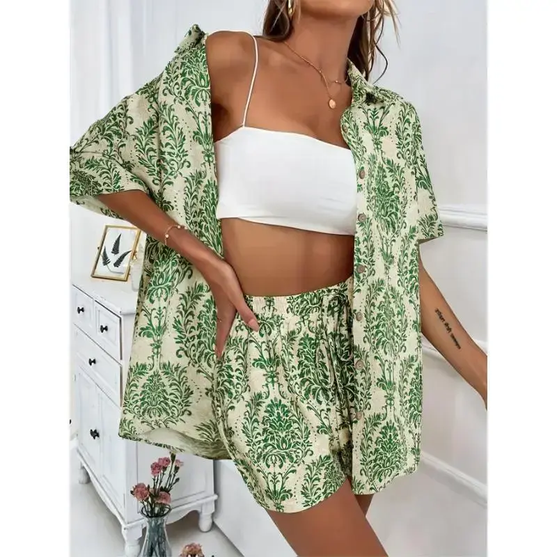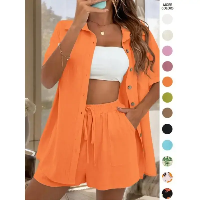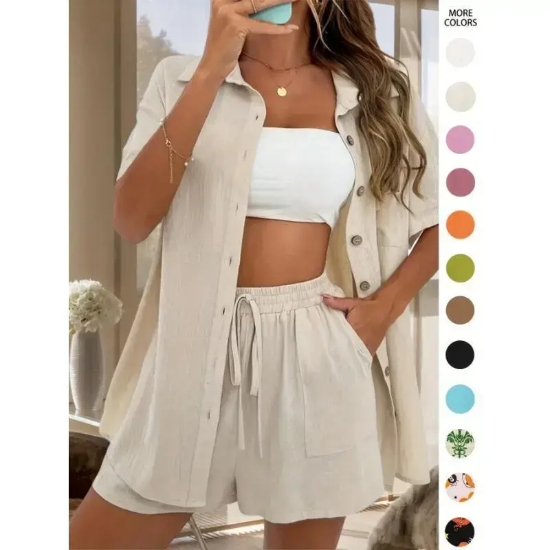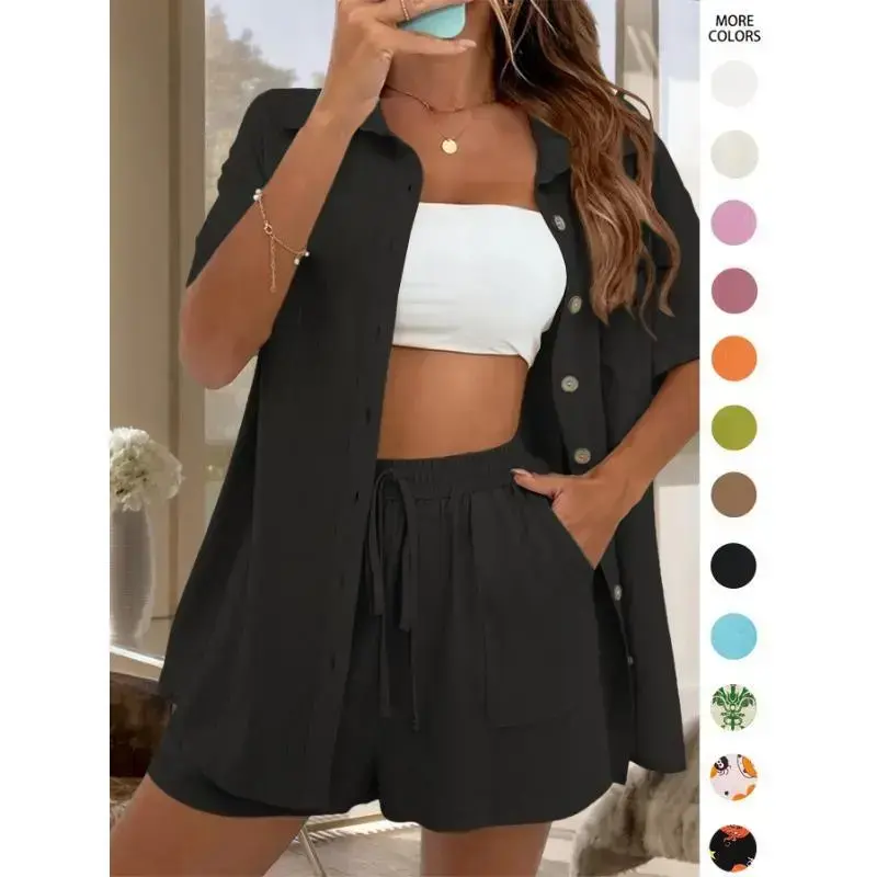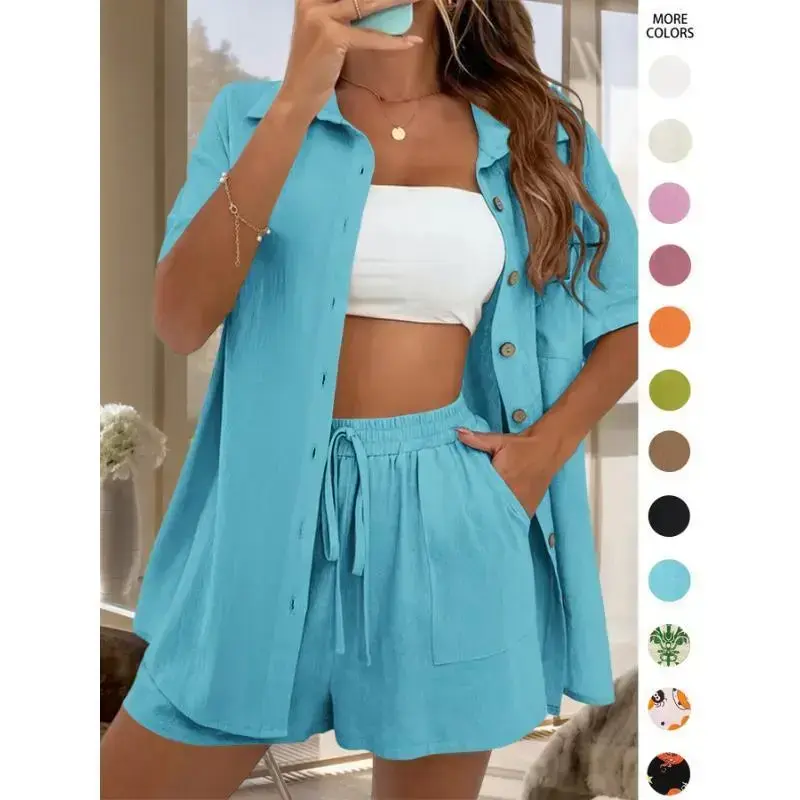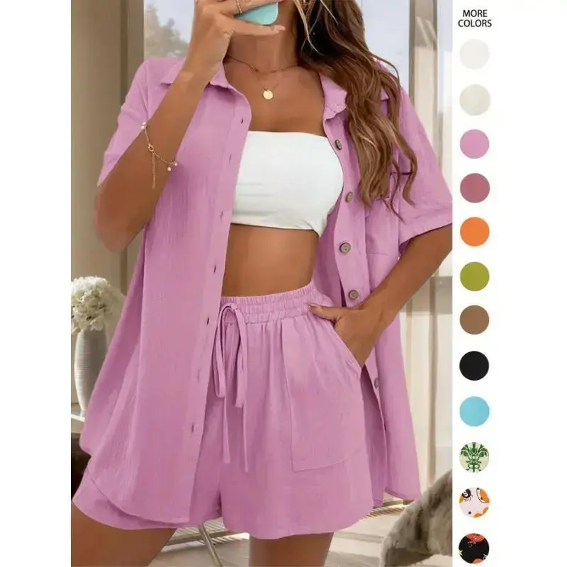 Vacation Style Solid Color Shorts Set with a Front-Button Short-Sleeve Shirt And Shorts, a Two-Piece Outfit for Women.