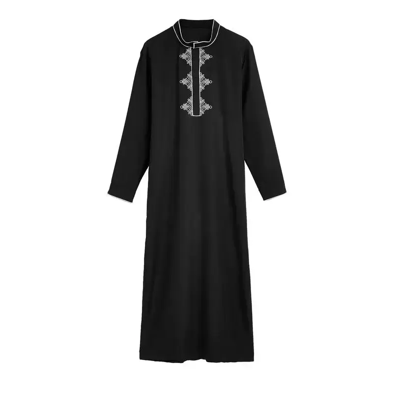 Islamic Muslim Thobe, Men's Casual Black Long Sleeve Classic Embroidery Robe, Ramadan Eid Kaftan 1.Material: Crafted from a premium blend of 95% polyester and 5% elastane, this Men's Classic Traditional Thobe features a soft, smooth texture that allows for natural movement while remaining cool and comfortable in various climates. 2.Design: This Islamic Muslim robe features a classic stand collar and regular long sleeves, offering a sophisticated yet relaxed silhouette.The textured pattern adds subtle detail, making the robe a stylish option for both traditional and modern settings.Its long length ensures a graceful, distinguished look suitable for any occasion. 3.Style: The thobe??s design makes it perfect as both traditional wear and a contemporary fashion statement.Wear it as part of your cultural attire for religious ceremonies, or style it as a formal piece for elegant gatherings and events.Its minimalist, yet elegant look also makes it perfect for casual outings or even as a stylish loungewear option. 4. Occasions: Ideal for formal occasions like weddings, religious events, or festive celebrations such as Eid and Ramadan. This black thobe is also suitable for casual gatherings, making it a versatile addition to your wardrobe for both special occasions and day-to-day wear. Details: Pocket Neckline: Stand Collar Sleeve Type: Regular Sleeve Color: Black Pattern Type: Textured Pattern Fit Type: Loose Length: Long Sleeve Length: Long Sleeve Material: Woven Fabric Composition: 95% Polyester, 5% Elastane Care Instructions: Hand wash or professional dry clean Sheer: No Fabric: Non-Stretch Body: Unlined Pockets: Yes