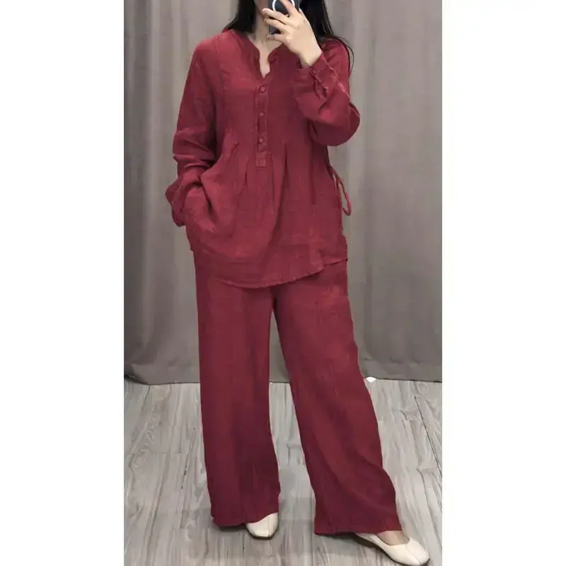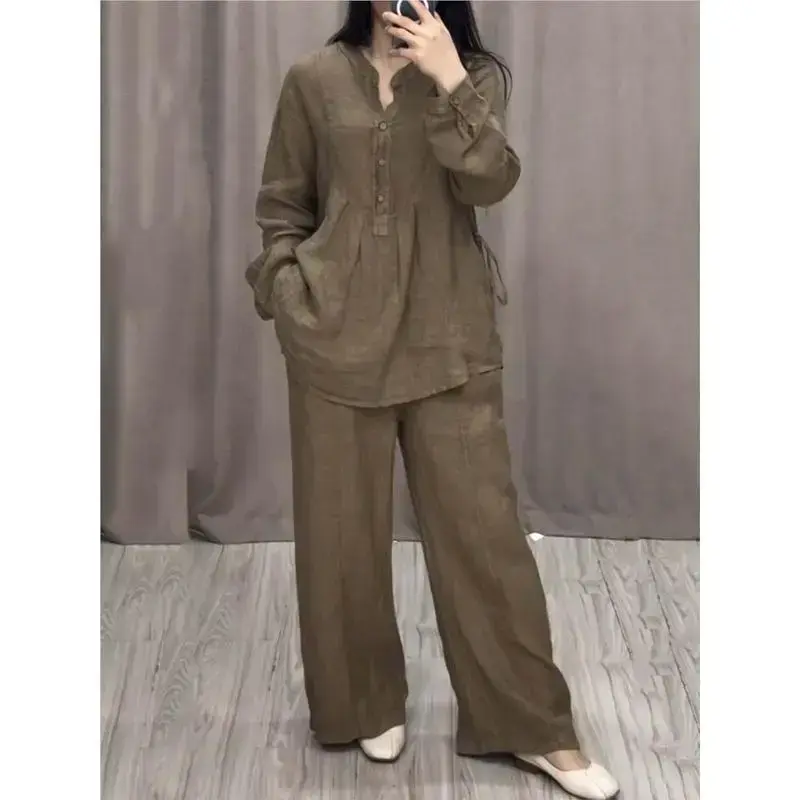 Women's 2 Piece Set Fashion Office Lady Cotton Linen Long-sleeve Casual Loose Wide-leg Pants Suit 2024 Spring Autumn Women Sets