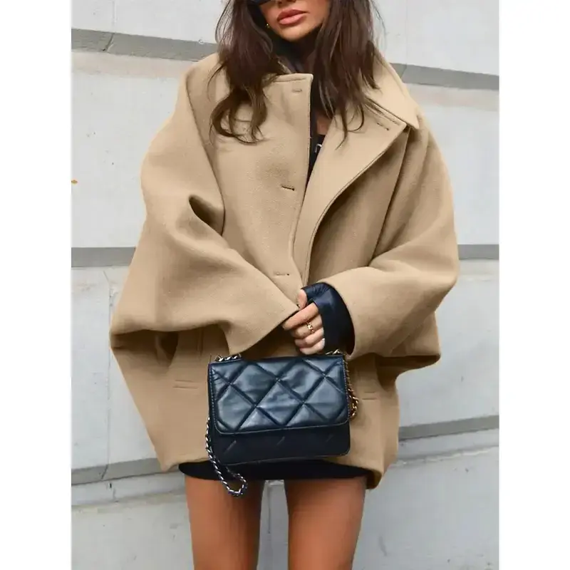 French Style European and American Fashion Asymmetric Design Loose Long Sleeve Turn-Down Collar Wool Coat Womenswear Jackets