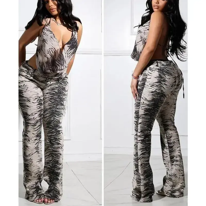 2025SummerVintageAttractivePrintWomen2PieceSetFashionPrintedHalterCleavageLaceUpTanks+HighWaistPantsMujerPartySuit