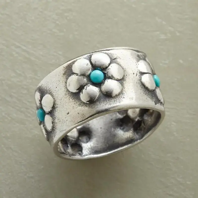 Vibrant Silvery Flower Turquoise Wide Ring - Unique Boho Chic Accessory for Daily Wear and Vacation - Unisex Gift Idea with Fashion Personality