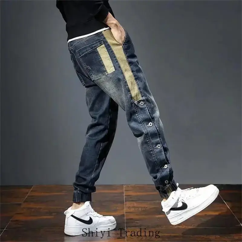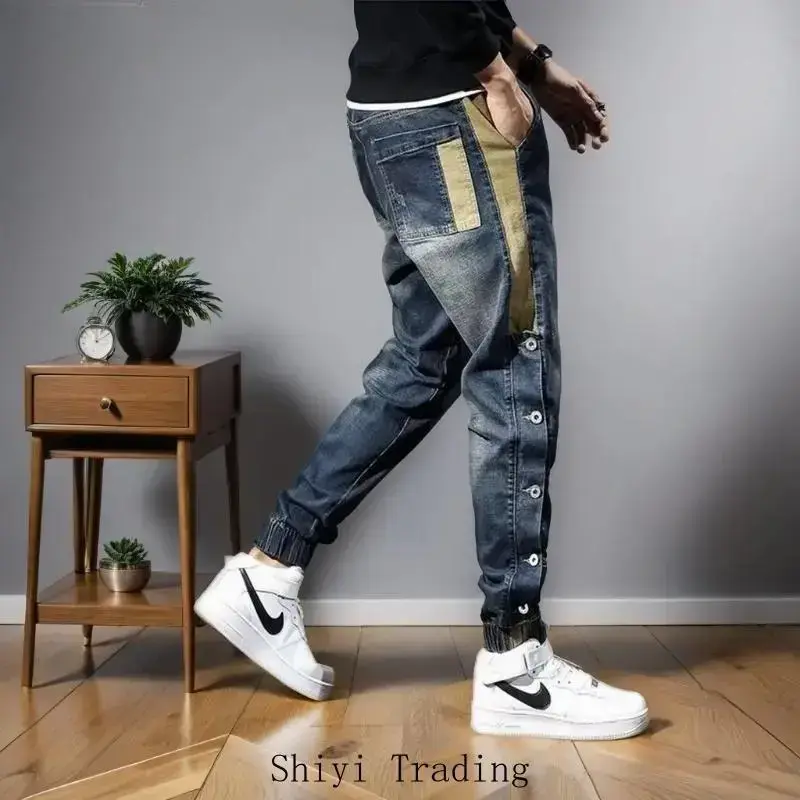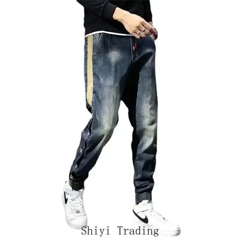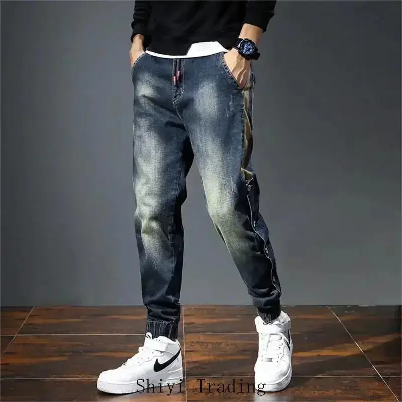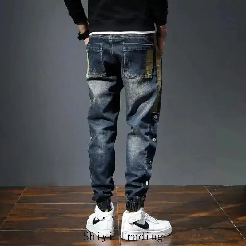 Mens Jeans Harem Pants man Stretch Slim Drawstring Casual Jogging Denim Trousers Male Hip Hop men clothing Pocket 304 Blue_Beige Streetwear Menswear