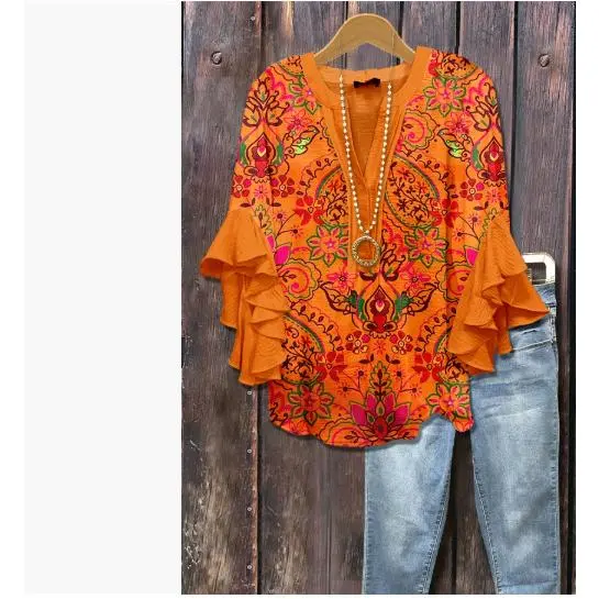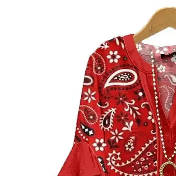 Aboutthisitem: DistinctivePaisleyPattern:Thisredtopisadornedwithblackandwhitepaisleypatterns,presentingauniqueandeye-catchinglookthatmakesitstandoutfromthecrowd. ElegantV-neckDesign:TheV-neckaddsatouchofsophistication,elongatingthenecklineandenhancingtheoveralleleganceoftheoutfit. CharmingRuffledThree-quarterSleeves:Theruffledthree-quartersleevesbringafeminineandplayfulelement,makingthistopafashionablechoice. ExquisiteDetails:Thepaisleypatternsaremeticulouslydrawnwithsmoothlinesanddistinctcolorcontrasts.Theruffledcuffsareneatlysewn,demonstratingsuperiorcraftsmanship. VersatileandPractical:Whetherpairedwithjeanstoshowacasualandlaid-backstyleormatchedwithashortskirttocreatealivelyatmosphere,itcanbeeasilycarriedoff,suitableforavarietyofoccasions.Itisapracticalitemforcreatingfashionablelooks.PackageInclude:1*Top