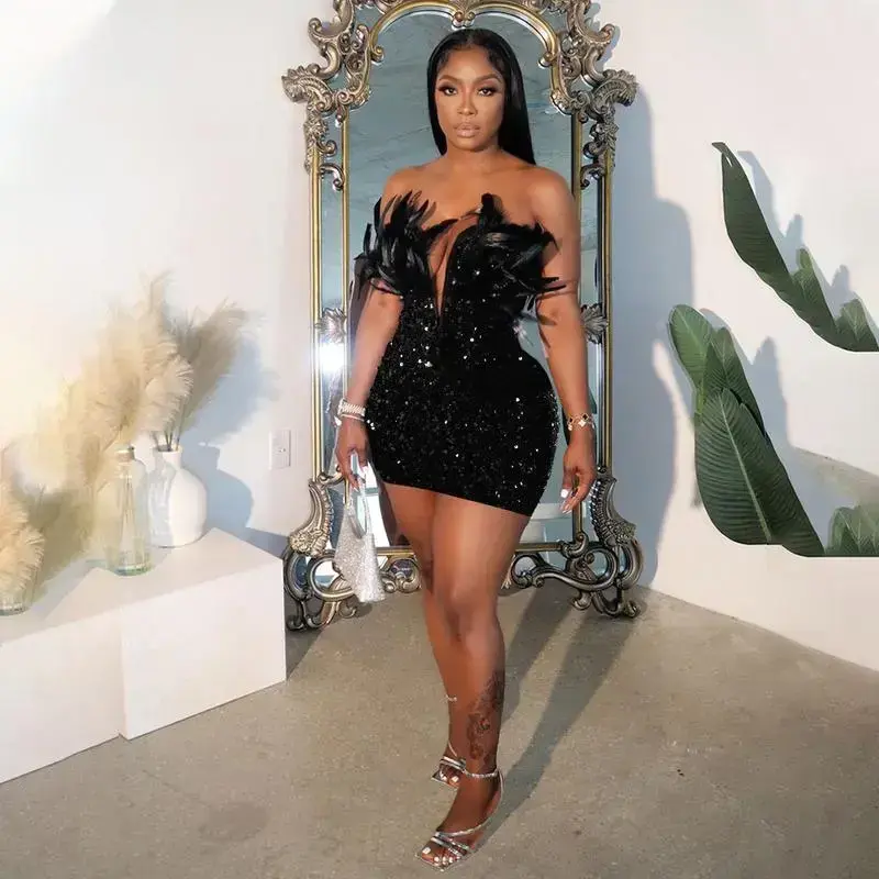 Sequin Deep V-Neck Strapless Feather Bodycon Short Dress Casual Womenswear Formal Basic Elegant Slit Hem Black