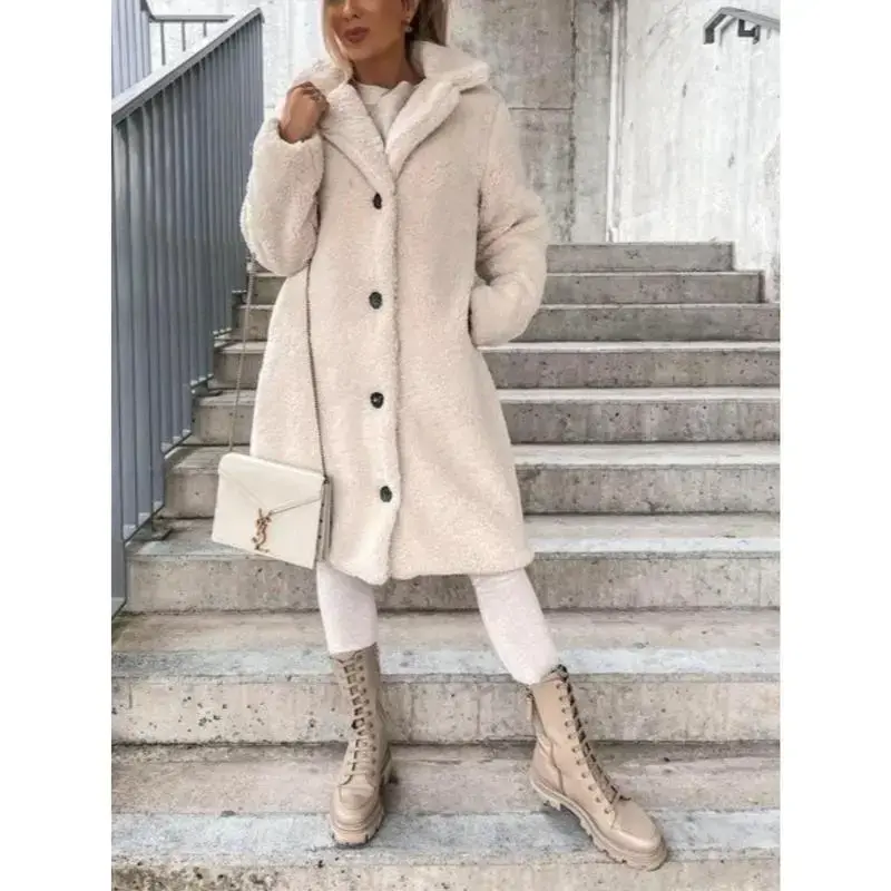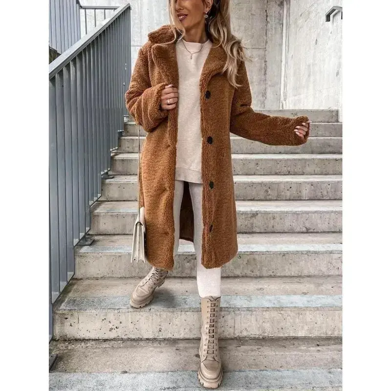 Women's Brown Teddy Fleece Long Coat ? Material & Warmth ? Teddy fleece material ensures a warm and skin-friendly feel. This soft, fluffy fabric locks in warmth, perfect for fall/winter wear. It balances comfortable wrapping with cold-resistant practicality, making it ideal for chilly days. Design & Style ?? Lapel Button Design ?? The classic lapel and single-breasted button combination offers a retro and stylish look. The button closure is easy to adjust, enhancing the coat's styling delicacy and suitability for various temperature scenarios. Fit & Comfort ?? Long Loose Fit ?? The long cut fits sizes S-XXL, gently covering waist/hip shortcomings. It creates a lazy elegant dressing effect, enhancing height and slimness, and boosting the overall atmosphere. Versatility ??? Scenarios ??? Pair this coat with sweaters, hoodies, jeans, and other innerwear/bottoms. It is suitable for daily commutes, casual shopping, and light formal gatherings. A core warm item for fall/winter wardrobes. Specifications