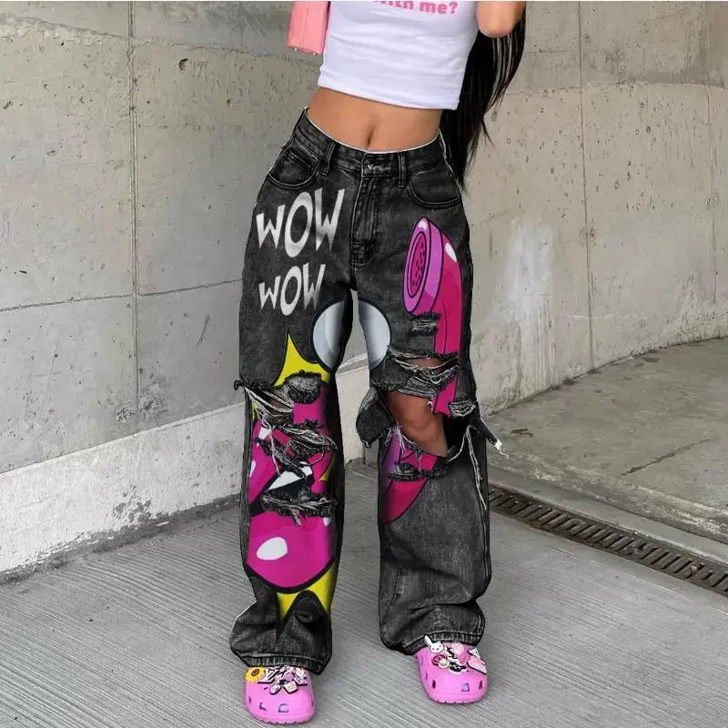 Summer women's jeans high quality long hollow holes best-selling European and American wide-leg pants trousers women's clothing