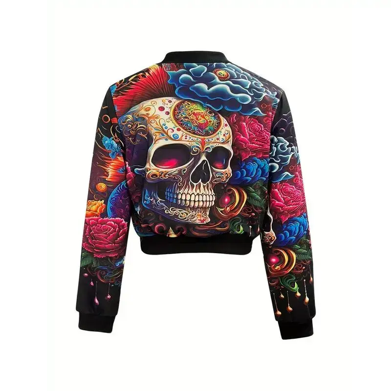 Vintage Skull Print Casual Long Sleeve Bomber Jacket - Women's Zip-Up Outerwear for Fall/Winter