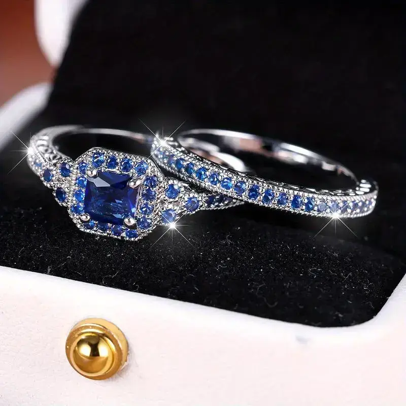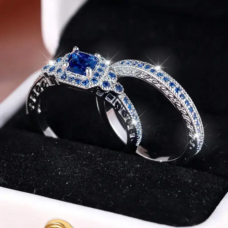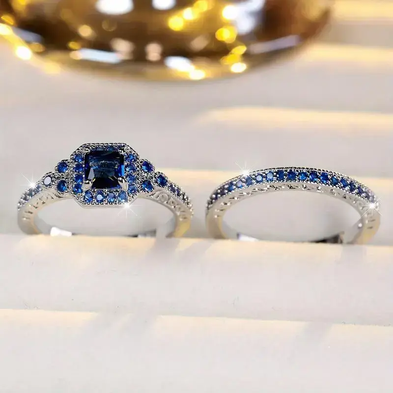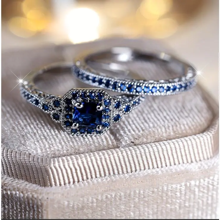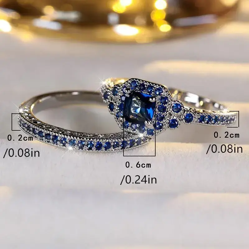 2pcs/Set Fashion Princess Cut Blue Stone Engagement Ring Set Silvery Color Circle Ring Set Wedding Jewelry