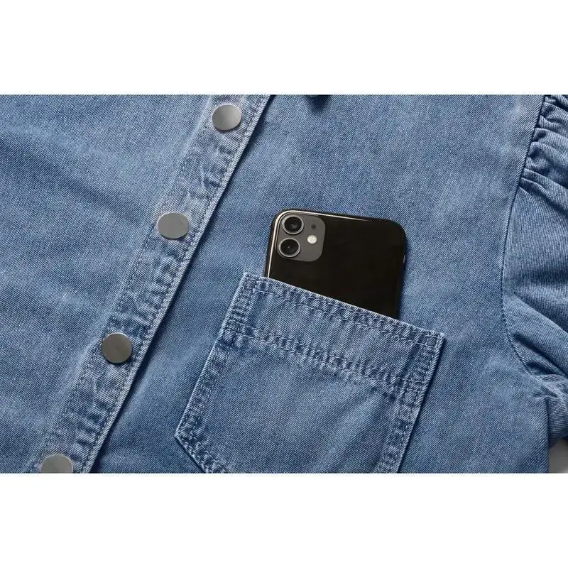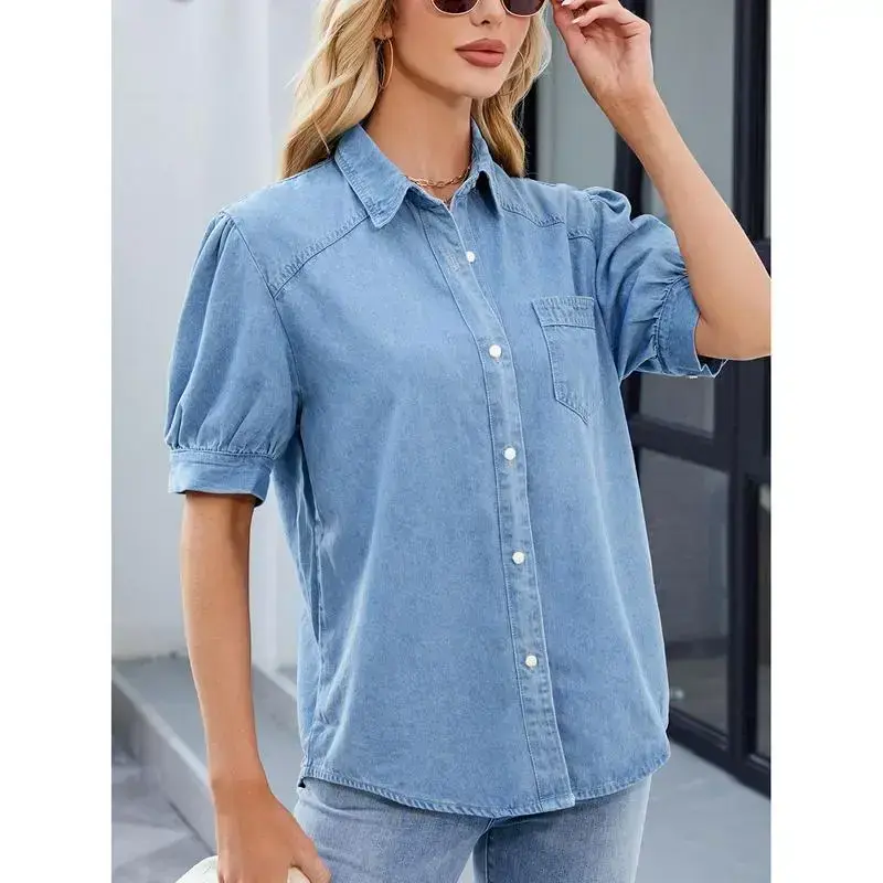 Ladies' casual washed bubble sleeves denim button up shirt, cute retro denim short sleeved top