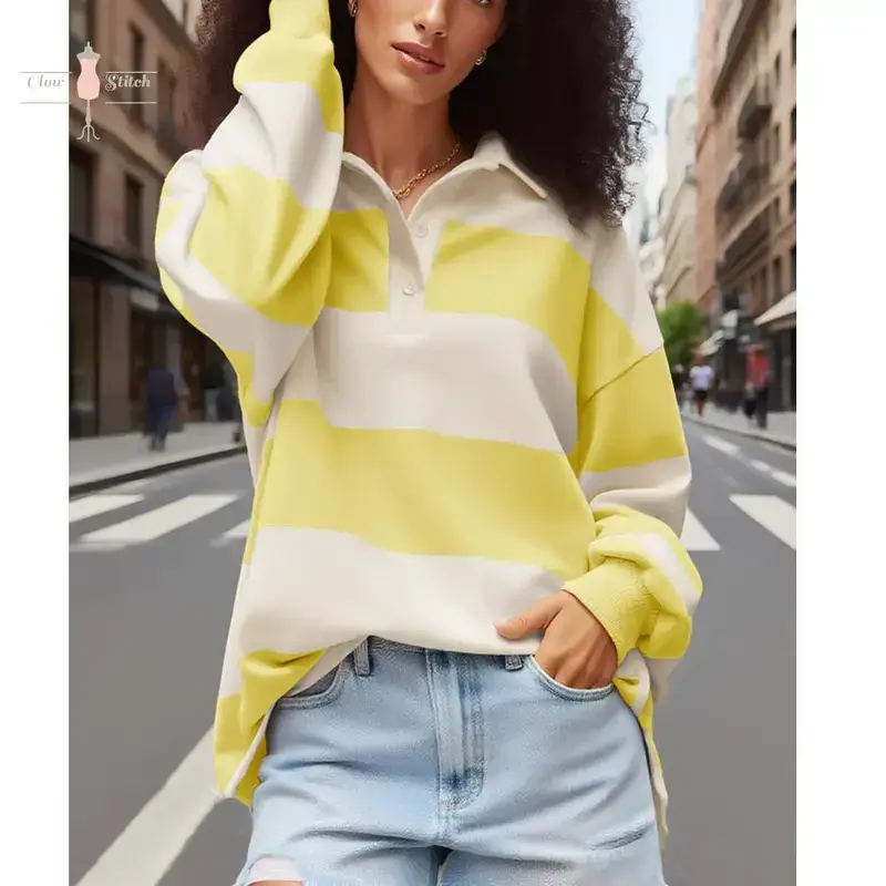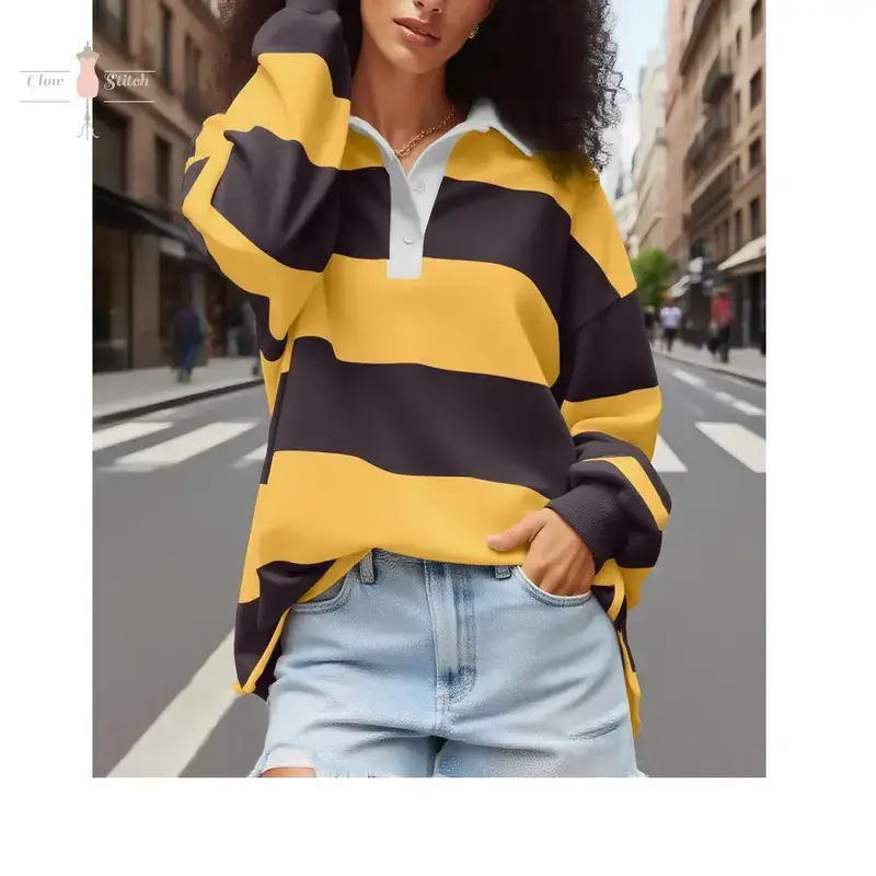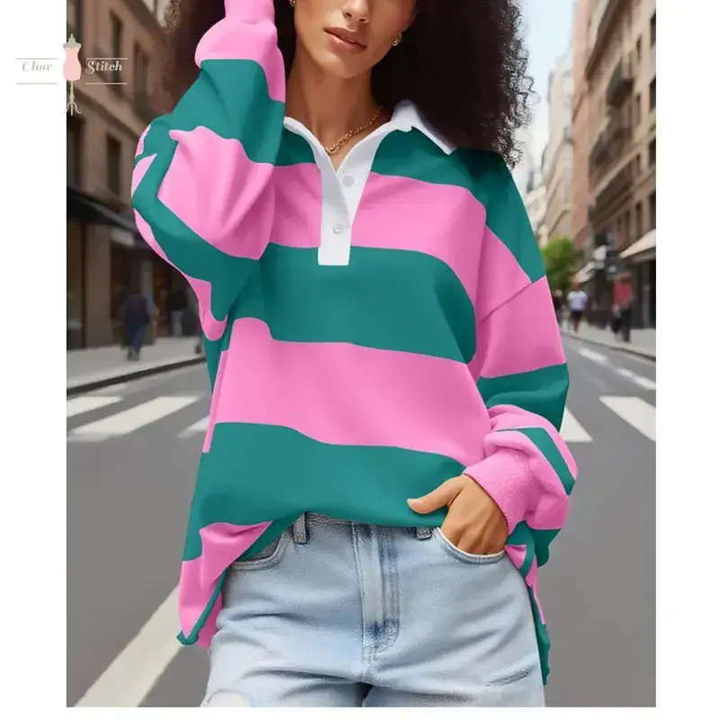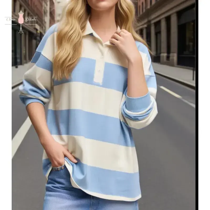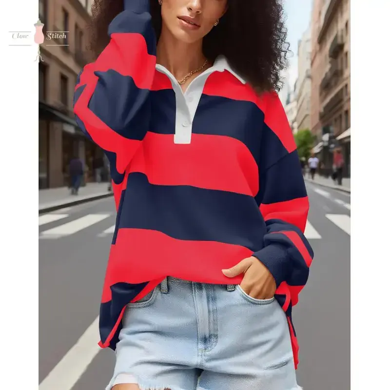 Rugby Shirt Women Striped Collared Long Sleeve Polo Shirts Oversized Color Block Sweatshirt Vintage Pullover Top Upgrade your wardrobe with our premium Polo shirts crafted from 100% Polyester for a comfortable and stylish fit. Available in sizes S, M, L, and XL, our shirts come in vibrant blue and bold red colors to suit your preference. The classic Polo design is perfect for any occasion, offering a timeless and versatile look that pairs effortlessly with your favorite bottoms. Our shirts are designed for durability and long-lasting wear, ensuring you stay comfortable and fashionable all day long. Treat yourself to a touch of luxury without compromising on quality with our Polo shirt collection. Size Chart:- S: Chest 36-38 inches, Length 28 inches- M: Chest 38-40 inches, Length 29 inches- L: Chest 40-42 inches, Length 30 inches- XL: Chest 42-44 inches, Length 31 inches