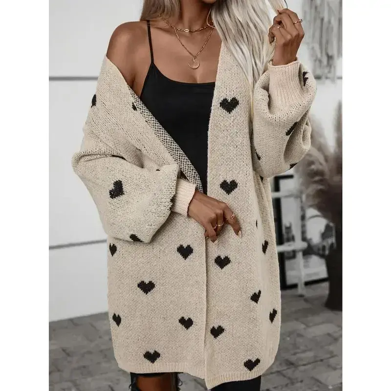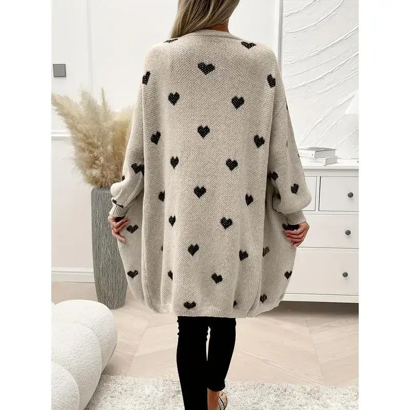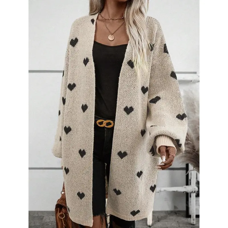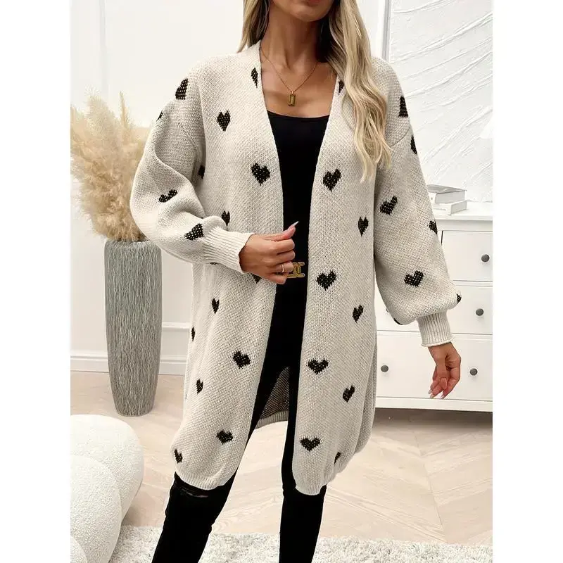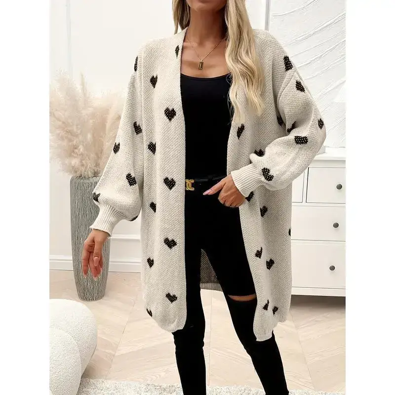 Heart Pattern Open Front Knitted Cardigan, Casual Long Sleeve Drop Shoulder Cardigan For Winter & Fall, Women's Clothing
