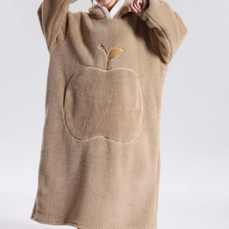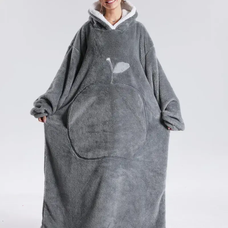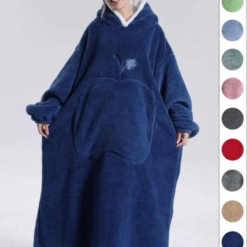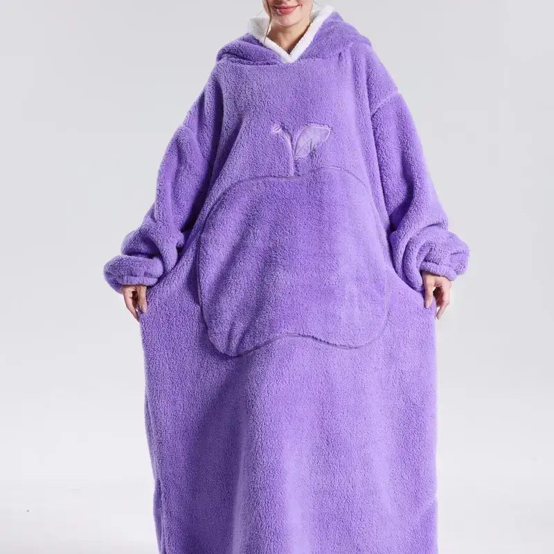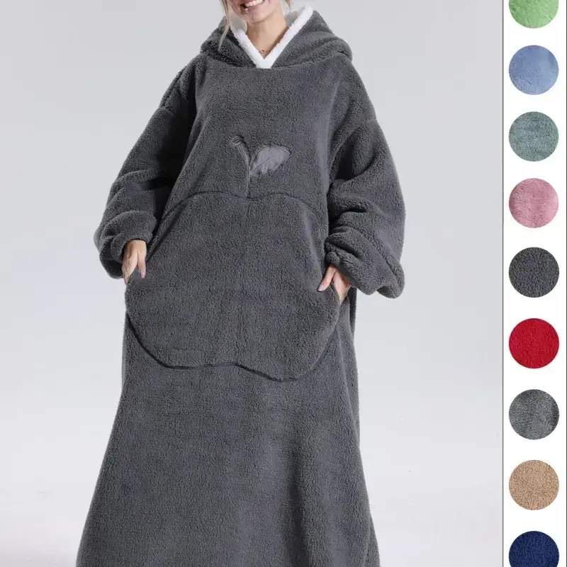 Women's Solid Pocket Hooded Flannel Lounge Robe, Casual Drop Shoulder Long Sleeve Robe, Oversized Blanket Hoodie, Comfortable Giant Wearable Blanket, Sherpa Fleece Wearable Blanket with Big Pocket, Women's Sleepwear for Fall & Winter, Fluffy Pajamas