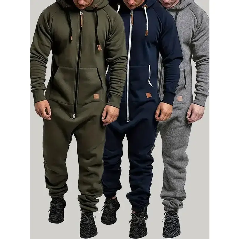 Set of 3 - Men's Hooded Fleece Lined Jumpsuit, Long Sleeve Full Zip Jumpsuit with Kangaroo Bag