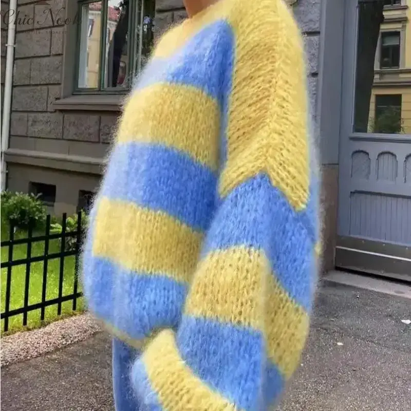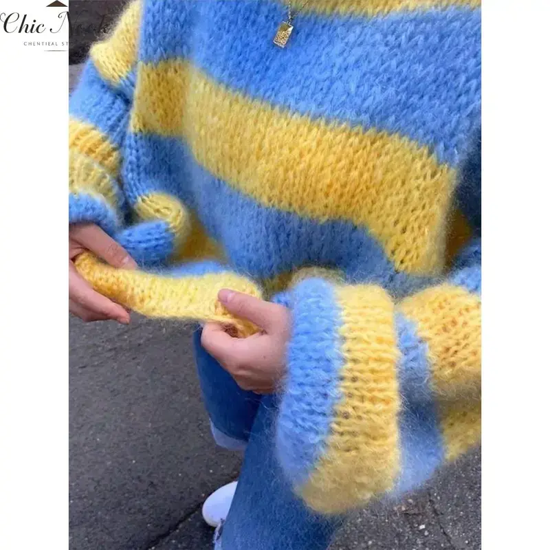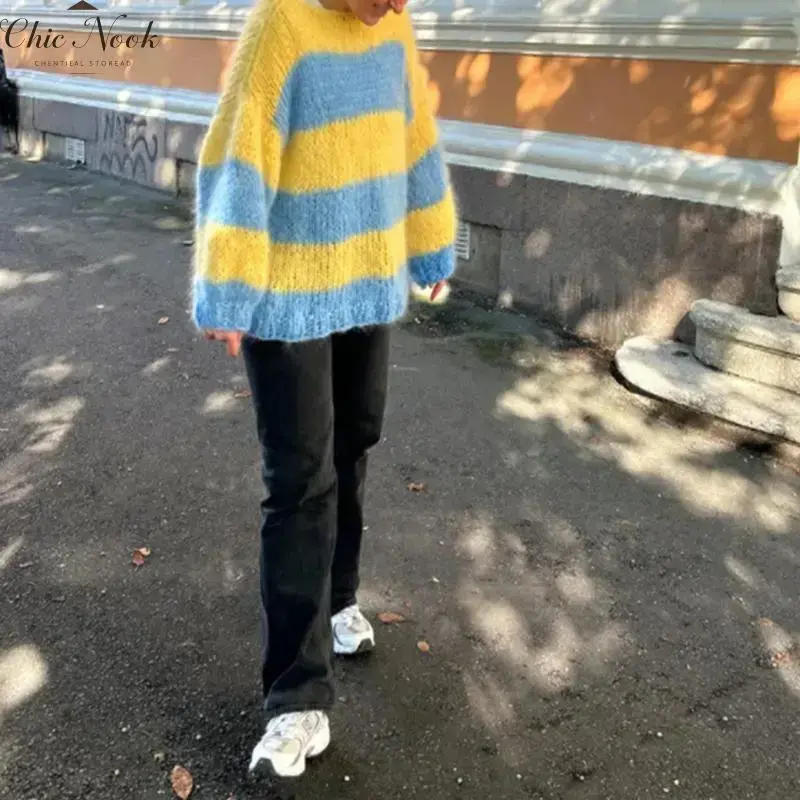 Womens Striped Sweater Round Neck Color Block Long Sleeve Loose Casual Pullover Jumpers