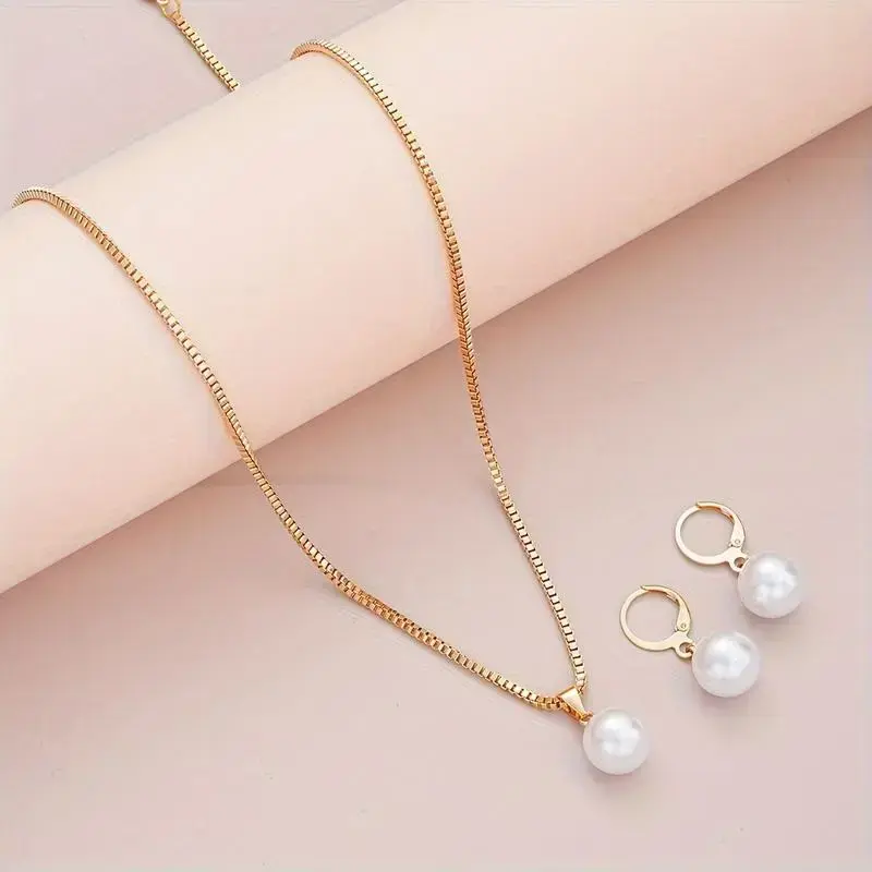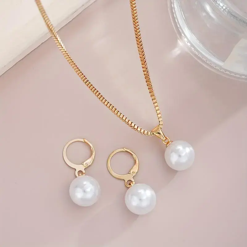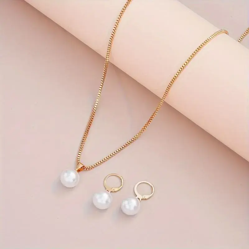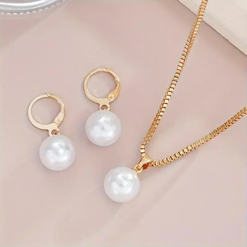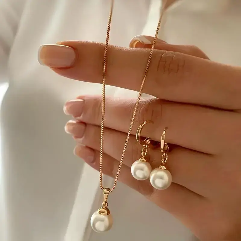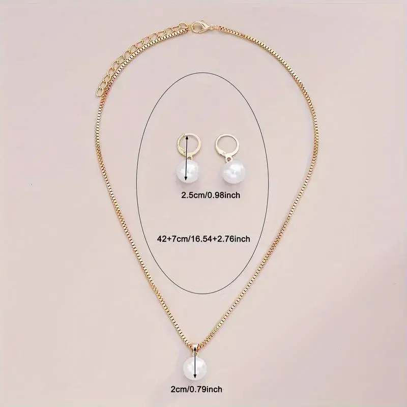 Elegant 3PCs faux pearl jewelry set for women-copper earrings & necklace, perfect for dates, vacations, parties, and Everyday Chic