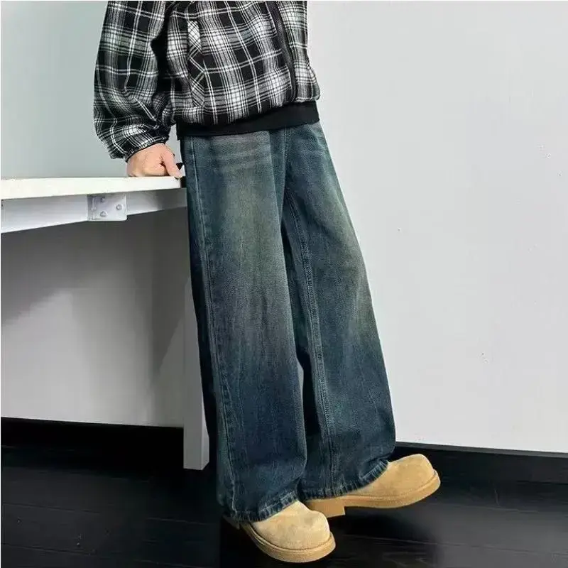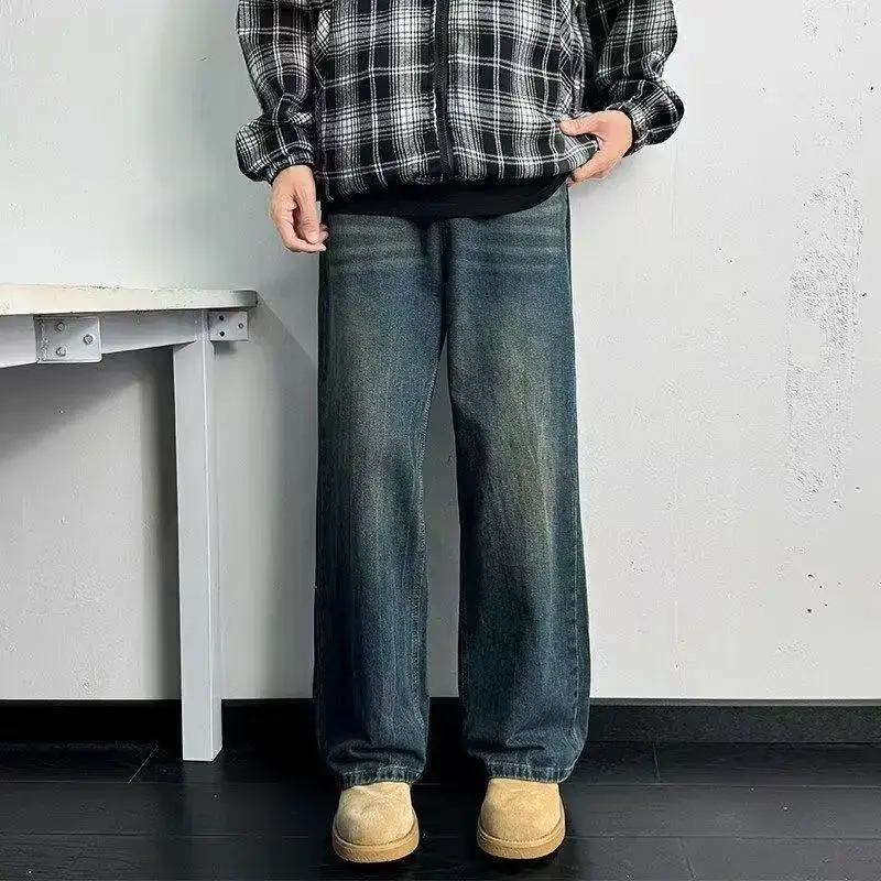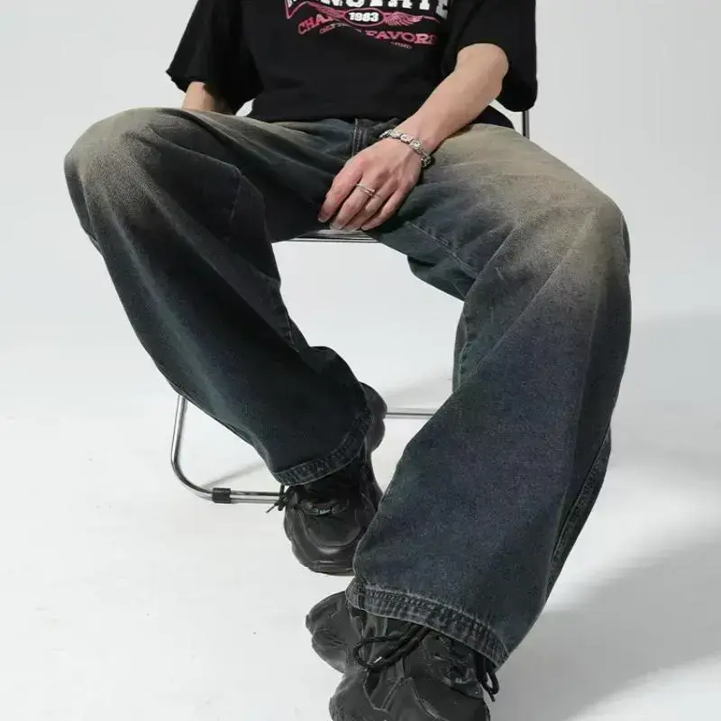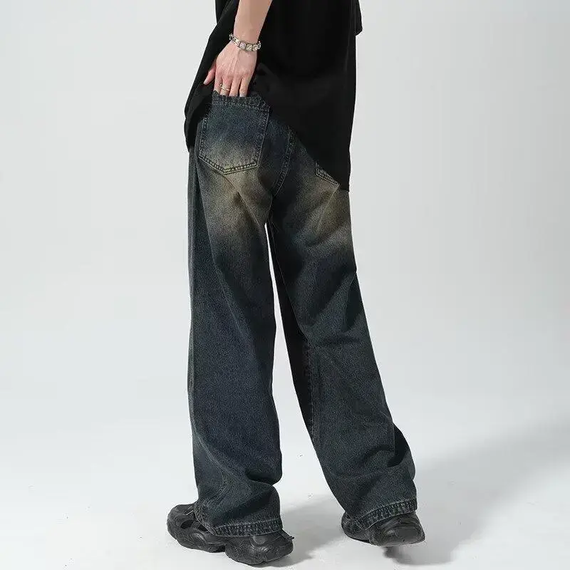 Men's Vintage Wash Pocket Wide Leg Jeans - Loose Casual Comfy Denim Pants for Daily Wear, Beige Plain Black [Xk] [T809] Graduation Outfit Trouser baggy jeans men baggy pants