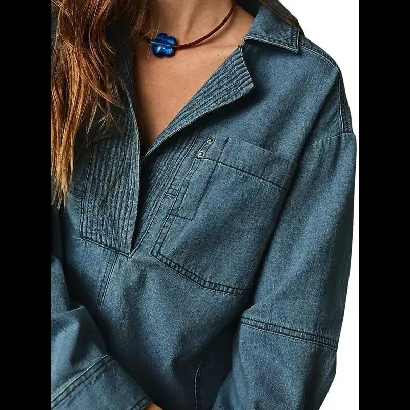 Women's denim pullover casual and comfortable button down V-neck shirt loose top long sleeved denim jacket with pockets