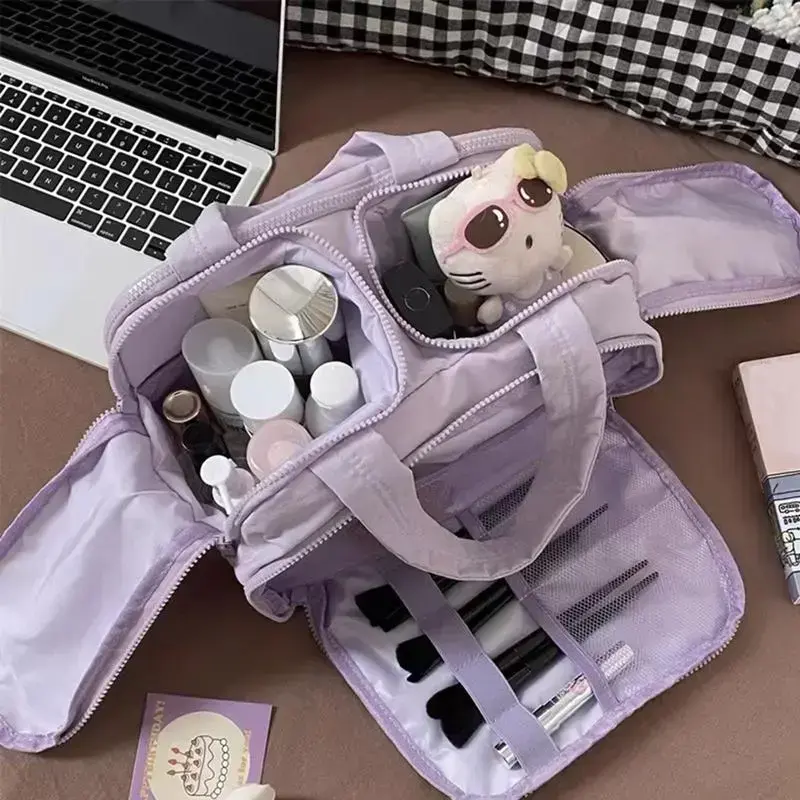 Material:PolyesterFeature:Waterproof,Multi-Function,Built-inOrganizer,Foldable,Multi-Compartment,High-CapacityFasteningType:Zip LargeCapacity:Size-12.2''Lx7.5''Wx8.3'H.Thetraveltoiletrybagwith4compartmentscanperfectlyorganizeyournecessarytraveltoiletriesandmakeupstorage UltraLightandSoftMaterials:Madeofsofthighqualitymaterial.Thispuffertoiletrybagfeelslikecottoncandy,givingpeoplearelaxedandcomfortableatmosphere.Alsoareliable,functional,andfashionablemakeupbag.EfinitelyanidealChristmasgiftforyourself,yourfamily,andyourfriend EasyAccessandKeepUpright:Fullopeningandnotpilingupforeasyaccesstoitems.Doublesidefullopendesignoftravelbagkeepscosmeticbottlesandtoiletriescanstanduprightinthemiddlecompartment.Avoidleakageduringtransit Dry-and-WetSeparation:ThelargetoiletrybagwithawaterproofPVCfabricandafrontzipperpocketcanhelpkeepwetanddryitemsseparateandmakeiteasytoclean ExcellentFunctionality:designallowsyoutogetatravelbagfortoiletries,shavingkitormakeupbag,allinone.It'sachoiceforbusinesstrips,travel,gym,camping,homeuse,andmore Whatyouget:1PCBag(Excludingornament)