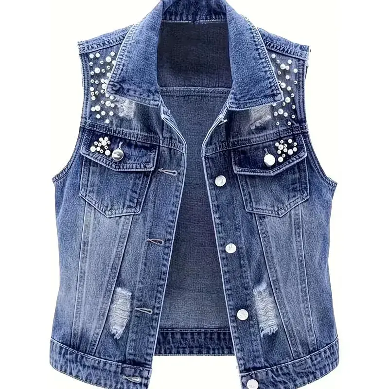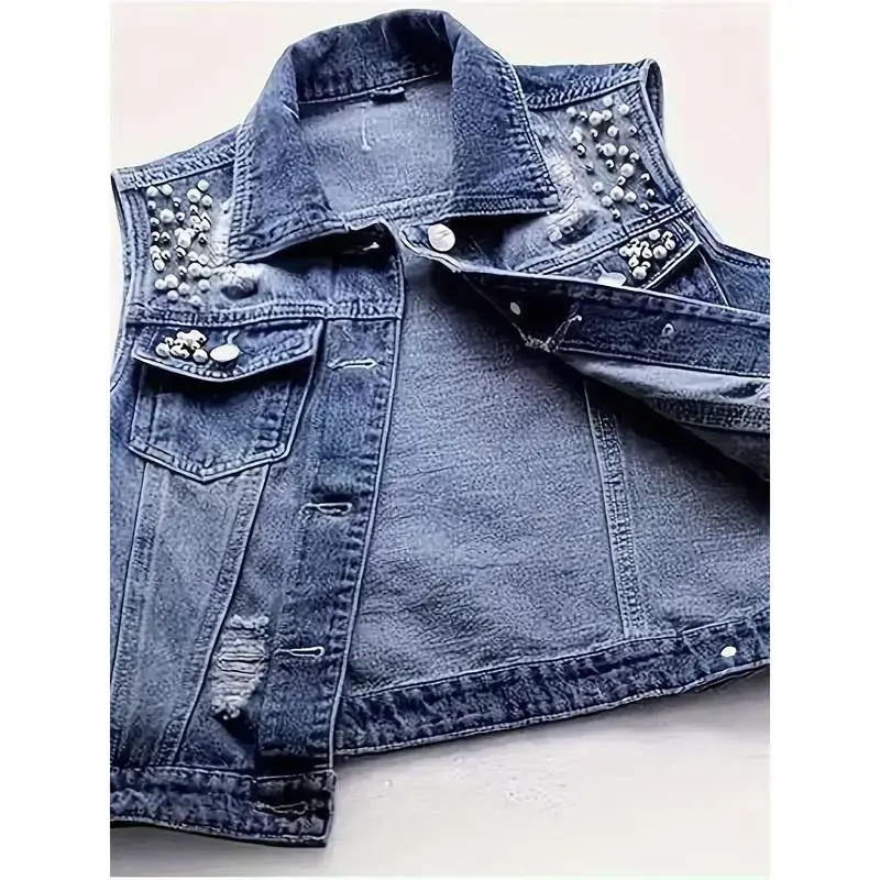 Denim Vest For Women Sleeveless Pearl Outerwear Cropped Vests Button Closure Coat Large Size Jean Jacket Coat